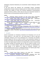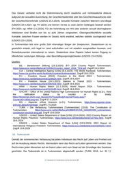 Überbelegung, körperlicher Misshandlung und unzureichenden sanitären Bedingungen (USDOS 23.4.2024). Es gibt keine Berichte über willkürliche oder unrechtmäßige Tötungen, einschließlich außergerichtlicher Tötungen vonseiten der Regierung oder ihrer Vertretern während 2023 (USDOS 23.4.2024). Nach Angaben von NGOs sind Turkmenen gewaltsamem Verschwindenlassen ausgesetzt (FH 2024; vgl. HRW 11.1.2024), wobei seit mehr als zwei Jahrzehnten Dutzende von Menschen Opfer des Verschwindenlassens geworden sind (HRW 11.1.2024). Quellen: - BS – Bertelsmann Stiftung (19.3.2024): BTI 2024 Country Report Turkmenistan, https://www.ecoi.net/en/file/local/2105842/country_report_2024_TKM.pdf, Zugriff 19.6.2024 - FH – Freedom House (2024): Freedom in the World 2024 - Turkmenistan, https://www.ecoi.net/de/dokument/2108024.html, Zugriff 19.6.2024 - HRW – Human Rights Watch (11.1.2024): World Report 2024 - Turkmenistan, https://www.ecoi.net/de/dokument/2103182.html, Zugriff 19.6.2024 - OHCHR – Office of the United Nations High Commissioner for Human Rights (o.D.): View the ratification status by country or by treaty, https://tbinternet.ohchr.org/_layouts/15/TreatyBodyExternal/Treaty.aspx? CountryID=180&Lang=en, Zugriff 17.5.2024 - TURK – Die Verfassung Turkmenistans [Turkmenistan] (2016): The Constitution of Turkmenistan, https://www.ecoi.net/en/file/local/1086053/1226_1484303330_turkmenistan- constitution-am2016-eng.pdf, Zugriff 19.6.2024 - USDOS – United States Department of State [USA] (23.4.2024): 2023 Country Report on Human Rights Practices: Turkmenistan, https://www.ecoi.net/de/dokument/2107632.html, Zugriff 19.6.2024 7. Korruption Gemäß Korruptionsindex von Transparency International wird Turkmenistan mit 18 von 100 Punkten bewertet (0 = sehr korrupt, 100 = sehr wenig korrupt) (TI 2024). Es gibt keine unabhängigen Institutionen, die sich mit der Bekämpfung der in Turkmenistan weit verbreiteten Korruption befassen (FH 2024; vgl. USDOS 23.4.2024). Es gibt strafrechtliche Sanktionen für Korruption durch Beamte, doch die Regierung setzt das Gesetz dafür nicht wirksam um (USDOS 23.4.2024). Das Vorgehen gegen Korruption ist in der Regel selektiv und steht im Zusammenhang mit Konflikten innerhalb der herrschenden Elite (FH 2024; vgl. USDOS 23.4.2024). Zu den Faktoren, die zur Korruption beitragen, gehören das Vorhandensein von Klientelnetzwerken, niedrige Gehälter in der Regierung, ein Mangel an finanzieller Transparenz und Rechenschaftspflicht sowie die Angst vor Vergeltungsmaßnahmen der Regierung gegen Bürger, die auf korrupte Handlungen hinweisen wollen (USDOS 23.4.2024). Quellen: - FH – Freedom House (2024): Freedom in the World 2024 - Turkmenistan, https://www.ecoi.net/de/dokument/2108024.html, Zugriff 19.6.2024 - TI – Transparency International (2024): Corruption Perceptions Index 2023, https://images.transparencycdn.org/images/CPI-2023-Report.pdf, Zugriff 19.6.2024 .BFA Bundesamt für Fremdenwesen und Asyl Seite 10 von 22