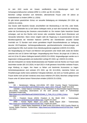 Zusätzlich ratifizierte Turkmenistan im Jahr 2000 völkerrechtlich das Zweite Fakultativprotokoll zum Zivilpakt, das auf die Abschaffung der Todesstrafe abzielt (OHCHR o.D.). Quellen: - OHCHR – Office of the United Nations High Commissioner for Human Rights (o.D.): View the ratification status by country or by treaty, https://tbinternet.ohchr.org/_layouts/15/TreatyBodyExternal/Treaty.aspx? CountryID=180&Lang=en, Zugriff 17.5.2024 - TURK – Die Verfassung Turkmenistans [Turkmenistan] (2016): The Constitution of Turkmenistan, https://www.ecoi.net/en/file/local/1086053/1226_1484303330_turkmenistan- constitution-am2016-eng.pdf, Zugriff 19.6.2024 11. Relevante Bevölkerungsgruppen 11.1. Frauen Es gibt vonseiten Turkmenistans Bemühungen, den institutionellen und politischen Rahmen zu verbessern, um die Beseitigung der Diskriminierung von Frauen zu beschleunigen und die Geschlechtergleichstellung zu fördern (CEDAW 20.2.2024). Obwohl Frauen den Männern rechtlich gleichgestellt sind – gleiche Bezahlung, Zugang zu Krediten, die Möglichkeit, ein Unternehmen zu gründen und zu besitzen, sowie Zugang zu staatlichen Stellen (UDOS 23.4.2024; vgl. BS 19.3.2024), ist ihre Situation in der Gesellschaft prekär (BS 19.3.2024; vgl. HRW 11.1.2024), und sie haben aufgrund kultureller Vorurteile nicht die gleichen Chancen wie die Männer (BS 19.3.2024; vgl. USDOS 23.4.2024). Das Gesetz wird nicht wirksam durchgesetzt (USDOS 23.4.2024). Der Hauptgrund für die systematische Diskriminierung von Frauen in Turkmenistan ist die streng patriarchalische Gesellschaftsordnung (BS 19.3.2024). Die Beteiligung von Frauen am politischen Prozess wird gesetzlich nicht eingeschränkt, aber ihre Vertretung und ihr Einfluss sind begrenzt (USDOS 23.4.2024). In der stark patriarchalisch geprägten Gesellschaft Turkmenistans haben Frauen selten Zugang zu höheren Positionen in Politik und Wirtschaft (BS 19.3.2024). Der Zugang von Frauen und Mädchen zur Justiz wird nach wie vor durch Hindernisse wie ihre begrenzte Kenntnis ihrer Rechte und der zu ihrer Durchsetzung verfügbaren Rechtsmittel erschwert. Die Zahl von Zentren für Rechtshilfe ist begrenzt, insbesondere in ländlichen und abgelegenen Gebieten. Einzelpersonen können je nach ihrer finanziellen Situation ganz oder teilweise von den Prozesskosten befreit werden (CEDAW 20.2.2024). Traditionelle soziale und religiöse Normen tragen dazu bei, den Zugang von Frauen zu Bildung und wirtschaftlichen Möglichkeiten einzuschränken (FH 2024). Frauen steht eine medizinische Versorgung zu, einschließlich pränataler Versorgung und sicherer sowie wirksamer Empfängnisverhütung. Sie haben das Recht, Verhütungsmittel frei zu verwenden (USDOS 23.4.2024). .BFA Bundesamt für Fremdenwesen und Asyl Seite 15 von 22