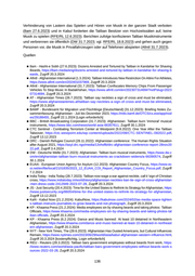 Verhinderung von Lastern das Spielen und Hören von Musik in der ganzen Stadt verboten (8am 27.6.2023) und in Kabul forderten die Taliban Besitzer von Hochzeitssälen auf, keine Musik zu spielen (RFE/RL 12.6.2023). Berichten zufolge konfiszieren Taliban Musikinstrumente und verbrennen sie öffentlich (DW 31.7.2023; vgl. RFE/RL 18.8.2023) und gehen auch gegen Personen vor, die Musik in Privatfahrzeugen oder auf Telefonen abspielen (Afintl 31.7.2023). Quellen ■ 8am - Hasht-e Sobh (27.6.2023): Dozens Arrested and Tortured by Taliban in Kandahar for Shaving Beards, https://8am.media/eng/dozens-arrested-and-tortured-by-taliban-in-kandahar-for-shaving-b eards, Zugriff 20.3.2024 ■ Afintl - Afghanistan International (1.3.2024): Taliban Introduces New Restriction On Attire For Athletes, https://www.afintl.com/en/202401037969, Zugriff 20.3.2024 ■ Afintl - Afghanistan International (31.7.2023): Taliban Confiscates Memory Chips From Passenger Vehicles To Stop Music In Badakhshan, https://www.afintl.com/en/202307314694?nxtPslug=2023 07314694, Zugriff 20.3.2024 ■ AT - Afghanistan Times (26.7.2023): Taliban say neckties a sign of cross and must be eliminated, https://www.afghanistantimes.af/taliban-say-neckties-a-sign-of-cross-and-must-be-eliminated , Zugriff 20.3.2024 ■ BAMF - Bundesamt für Migration und Flüchtlinge [Deutschland] (31.12.2023): Briefing Notes Zu sammenfassung: Afghanistan - Juli bis Dezember 2023, https://milo.bamf.de/OTCS/cs.exe/app/nod es/29188455, Zugriff 22.1.2024 [Login erforderlich] ■ BBC - British Broadcasting Corporation (31.7.2023): Afghanistan: Taliban burn ‘immoral’ musical instruments, https://www.bbc.com/news/world-asia-66357611, Zugriff 30.1.2024 ■ CTC Sentinel - Combating Terrorism Center at Westpoint (9.8.2022): One Year After the Taliban Takeover, https://ctc.westpoint.edu/wp-content/uploads/2022/08/CTC-SENTINEL-082022.pdf , Zugriff 13.12.2023 ■ DRC - Danish Refugee Council (28.11.2022): Afghanistan conference: The Human Rights Situation after August 2021, https://asyl.drc.ngo/media/13vhsflb/drc-afghanistan-conference-report-28nov20 22.pdf, Zugriff 3.4.2024 ■ DW - Deutsche Welle (31.7.2023): Afghanistan: Taliban burn musical instruments, https://www.dw.c om/en/afghanistan-taliban-burn-musical-instruments-as-crackdown-widens/a-66390574 , Zugriff 30.1.2024 ■ EUAA - European Union Agency for Asylum (12.2023): Afghanistan Country Focus, https://www.ec oi.net/en/file/local/2101835/2023_12_EUAA_COI_Report_Afghanistan_Country_Focus.pdf, Zugriff 7.2.2024 ■ India Today - India Today (28.7.2023): Taliban now wage a war against necktie, call it ’sign of Christian cross, https://www.indiatoday.in/world/story/afghanistan-neckties-ban-tie-sign-of-cross-afghanistan -men-dress-code-2412949-2023-07-28 , Zugriff 20.3.2024 ■ JS - Just Security (20.4.2023): Time for the United States to Rethink its Strategy for Afghanistan, https: //www.justsecurity.org/86054/time-for-the-united-states-to-rethink-its-strategy-for-afghanistan , Zugriff 13.12.2023 ■ KaN - Kabul Now (21.2.2024): KabulNow, https://kabulnow.com/2024/02/as-media-space-tighten s-taliban-instructs-journalists-to-grow-beards-and-not-photograph , Zugriff 20.3.2024 ■ KP - Khaama Press (21.2.2024): Media employees sin by shaving beards and taking photos: Taliban Officials, https://www.khaama.com/media-employees-sin-by-shaving-beards-and-taking-photos-tal iban-officials, Zugriff 20.3.2024 ■ KP - Khaama Press (6.2.2024): Dance and Music banned: At least 10 detained in Northeastern Afghanistan, https://www.khaama.com/dance-and-music-banned-at-least-10-detained-in-northeast ern-afghanistan, Zugriff 20.3.2024 ■ NYT - New York Times, The (29.6.2023): Afghanistan Has Ousted Americans, but Cultural Influences Remain, https://www.nytimes.com/2023/06/29/world/asia/kabul-afghanistan-western-influence.html , Zugriff 20.3.2024 [kostenpflichtig, Login erforderlich] ■ REU - Reuters (28.3.2022): Taliban bars government employees without beards from work, https: //www.reuters.com/world/asia-pacific/taliban-bars-government-employees-without-beards-work-s ources-2022-03-28 , Zugriff 20.3.2024 136