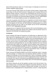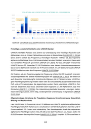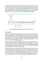 im Dezember die Zahl der Verhaftungen im Vergleich zum Vormonat um 80 Prozent auf 2.058 Personen. Davon entfielen mit 1.180 an der Zahl 35 Prozent auf Islamabad. Allerdings waren auch schon im November die Zahlen gestiegen (UNHCR/IOM 10.1.2025). Amnesty Internatio nal berichtet daraufhin, dass in der Woche nach Inkrafttreten zwischen 1. und 8. Jänner 2025 mehr als 800 Afghanen in Islamabad verhaftet wurden (AI 8.1.2025). Laut UNHCR wurden 285 Afghanen vom 1. bis zum 15. Jänner von Islamabad abgeschoben (VOA 16.1.2025). Quelle 15: UNHCR/IOM 10.1.2025Verhaftungen von Afghanen Monatsweise Abschiebungen Die Zahl der Abschiebungen nach Afghanistan hatte sich bereits nach der Machtübernahme der Taliban in Afghanistan erhöht. Direkt im Folgezeitraum wurden zwischen September und Oktober 2021 laut UNHCR 1.800 Personen zurückgeführt (UNHCR 22.12.2021). Die Abschiebungen gingen daraufhin zurück auf 1.740 Personen im gesamten Jahr 2022 (IOM 7.3.2023). Ab Jänner 2023 nahm die Zahl der Abschiebungen wieder stark zu (VB Islamabad 27.2.2023). Auch Frauen und Kinder waren betroffen (Guardian 10.1.2023). Nach der Verkündung des Repatriierungsplanes registrierte IOM für den Monat Oktober 2023 - also noch vor Ablauf der Deadline zur freiwilligen Ausreise - 959 Abschiebungen. Vom 1. bis zum 30. November verzeichnete UNHCR schließlich 24.506 Abschiebungen (UNHCR 23.10.2024). Im Erhebungszeitraum vor der Ankündigung des Plans von 1. bis 15. September wurden zum Vergleich 228 Afghanen abgeschoben (IOM 22.9.2023). Nach dem Höhepunkt im November ging die Zahl der Abschiebungen stark zurück, auf zuerst 3.458 im Dezember 2023 und schließlich 632 im Jänner 2024, auf dessen Niveau die Zahlen sich mit Schwankungsbreiten einpendelte. Dementsprechend schreibt UNHCR auch von einer de facto Pause des Repatriierungsplans (UNHCR 23.10.2024). Insgesamt wurden im Zeitraum 15. September 2023 bis 2. November 2024 35.957 Afghanen abgeschoben. Darunter waren 1.972 PoR-Karteninhaber, das sind 5 Prozent aller Betroffenen (UNHCR/IOM 10.11.2024). 147