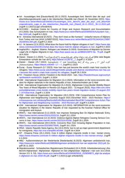 ■ MMC - Mixed Migration Centre (3.2023): The Changing Dynamics of Afghan Migration after August 2021, https://mixedmigration.org/wp-content/uploads/2023/03/266_Changing-Dynamics-Afghan-M igration.pdf, Zugriff 29.2.2024 ■ NRC - Norwegian Refugee Council (1.6.2023): Renewing key documents brings hope to Afghans in Iran, https://www.nrc.no/perspectives/2023/renewing-key-documents-brings-hope-to-afghans-in-i ran/, Zugriff 29.2.2024 ■ ÖB Teheran - Österreichische Botschaft Teheran [Österreich] (11.2021): Asylländerbericht – Islami sche Republik Iran, https://www.ecoi.net/en/file/local/2064921/IRAN_ÖB-Bericht_2021.pdf, Zugriff 7.2.2023 [Login erforderlich] ■ RFE/RL - Radio Free Europe/Radio Liberty (4.12.2023): Afghans Banned From 16 Provinces In Iran As Forced Exodus Continues, https://www.rferl.org/a/iran-afghans-banned-provinces/32713320.ht ml, Zugriff 19.1.2024 ■ RFE/RL - Radio Free Europe/Radio Liberty (18.10.2023): ’I’m Afraid’: Afghan Migrants Complain Of Rising Harassment, Violence In Iran, https://www.rferl.org/a/iran-afghanistan-migrants-violence/32 643181.html, Zugriff 19.1.2024 ■ SEM - Staatssekretariat für Migration [Schweiz] (29.8.2023): Afghanen: Einreise, Aufenthalt und Rückkehr, https://www.sem.admin.ch/dam/sem/de/data/internationales/herkunftslaender/asien-nah ost/irn/IRN-einreise-aufenthalt-afghanen-d.pdf.download.pdf/IRN-einreise-aufenthalt-afghanen-d.p df, Zugriff 28.2.2024 ■ SEM - Staatssekretariat für Migration [Schweiz] (30.3.2022): Focus Pakistan/Iran/Türkei Situation afghanischer Migrantinnen und Migranten, https://www.sem.admin.ch/dam/sem/de/data/internation ales/herkunftslaender/asien-nahost/afg/AFG-situation-migranten-d.pdf.download.pdf/AFG-situation -migranten-d.pdf, Zugriff 2.2.2023 [Login erforderlich] ■ Stimson - Stimson Center (24.10.2023): The Afghan Immigrant Crisis in Iran and the Rise of Afghan ophobia, https://www.stimson.org/2023/the-afghan-immigrant-crisis-in-iran-and-the-rise-of-afgha nophobia/, Zugriff 19.1.2024 ■ TN - Tolonews (11.12.2023): Over 345,000 Afghan Refugees Deported by Iran in Past 3 Months: Ministry, https://tolonews.com/afghanistan-186431, Zugriff 19.1.2024 ■ TN - Tolonews (20.2.2023): Afghan Refugees Without Papers in Iran Banned from University Enrol ment, https://tolonews.com/afghanistan-182156, Zugriff 16.4.2024 ■ UNGA - United Nations General Assembly (6.10.2023): Situation of human rights in the Islamic Republic of Iran, https://www.ecoi.net/en/file/local/2100731/N2329059.pdf, Zugriff 27.2.2024 ■ UNHCR - United Nations High Commissioner for Refugees (o.D.a): Are you a person that UNHCR Iran can support?, https://help.unhcr.org/iran/en/are-you-a-person-that-unhcr-iran-can-support/ , Zugriff 8.2.2023 ■ UNHCR - United Nations High Commissioner for Refugees (o.D.b): Headcount Exercise, https: //help.unhcr.org/iran/en/headcount-exercise/, Zugriff 9.2.2023 ■ UNHCR - United Nations High Commissioner for Refugees (o.D.c): What are the movement restric tions for Afghan and Iraqi nationals in Iran?, https://help.unhcr.org/iran/en/what-are-the-movemen t-restrictions-for-afghan-and-iraqi-nationals-in-iran/ , Zugriff 8.2.2023 ■ UNHCR - United Nations High Commissioner for Refugees (28.1.2024): Financial scheme for Afghans, https://help.unhcr.org/iran/en/2024/01/28/announcement-on-a-new-financial-sch eme-for-foreign-nationals/ , Zugriff 17.4.2024 ■ UNHCR - United Nations High Commissioner for Refugees (14.1.2024): UNHCR Iran: New Arrivals from Afghanistan - End December 2023, https://data.unhcr.org/en/documents/details/106053 , Zugriff 27.2.2024 ■ UNHCR - United Nations High Commissioner for Refugees (9.1.2024): IRAN Voluntary Repatri ation - January to December 2023, https://www.ecoi.net/en/file/local/2103015/Voluntary Repatriation dashboard - Jan to Dec 2023.pdf, Zugriff 27.2.2024 ■ UNHCR - United Nations High Commissioner for Refugees (31.12.2023): Operational Data Portal: Iran (Islamic Republic of), https://data.unhcr.org/en/country/irn#_ga=2.35569633.1958450366.1633 848450-1851780278.1615983680, Zugriff 27.2.2024 ■ UNHCR - United Nations High Commissioner for Refugees (1.12.2023): Education Away from Home, https://data.unhcr.org/en/documents/details/105138, Zugriff 16.4.2024 ■ UNHCR - United Nations High Commissioner for Refugees (19.11.2023): Announcement on head count slips, https://help.unhcr.org/iran/en/2023/11/19/announcement-on-headcount-slips/ , Zugriff 17.4.2024 166