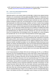 ■ WFP - World Food Programme (11.2.2024): Afghanistan Food Security Update - 4th Quarter (Decem ber 2023), https://www.ecoi.net/en/document/2104376.html, Zugriff 20.2.2024 24.1 Armut und Lebensmittelunsicherheit Letzte Änderung 2025-01-30 08:43 Afghanistan gehört zu den ärmsten Ländern der Welt (WB 1.7.2024) mit der weltweit höchsten Prävalenz von unzureichender Ernährung (WFP 25.6.2023). Seit 2021 ist in Afghanistan eine leichte Verbesserung der Ernährungssicherheit zu verzeichnen, obwohl das Land in den letzten Jahren mit einer Reihe bedeutender Herausforderungen konfrontiert war. Dazu gehören der politische Übergang im August 2021, die Auswirkungen der COVID-19-Pandemie und mehrere Naturkatastrophen wie Überschwemmungen, Erdbeben und Dürren. Darüber hinaus bewältigt das Land den Zustrom afghanischer Rückkehrer aus den Nachbarregionen, die weiterhin die Ressourcen belasten und die Ernährungssicherheit beeinträchtigen (WFP 9.7.2024; vgl. IPC 7.1.2025). Auch der Afghanistan Welfare Monitoring Survey (AWMS) vom Oktober 2023 deutet darauf hin, dass sich die Ernährungssicherheit afghanischer Haushalte seit den Monaten nach der Machtübernahme der Taliban am 15.8.2021 verbessert hat, auch wenn die meisten von ihnen ihre Grundbedürfnisse nicht befriedigen können. Dies spiegelt sich in einem Rückgang der Haushalte wider, die von einer akuten Nahrungsmittelkrise berichten (WB 10.2023). Laut einem Bericht des World Food Programme (WFP) sank der Anteil der Haushalte mit man gelhaftem Nahrungsmittelverbrauch im Juni 2023 kurzfristig auf 48%, stieg jedoch im Dezember 2023 wieder auf 54%, wobei Haushalte mit weiblichem Haushaltsvorstand sowie Haushalte mit Menschen mit Behinderung überproportional von den negativen Ergebnissen beim Lebensmit telkonsum betroffen sind (WFP 11.2.2024). Auch der Afghanistan Welfare Monitoring Survey (AWMS) vom Oktober 2023 deutet darauf hin, dass sich die Ernährungssicherheit afghanischer Haushalte seit den Monaten nach der Machtübernahme der Taliban am 15.8.2021 verbessert hat, auch wenn die meisten von ihnen ihre Grundbedürfnisse nicht befriedigen können. Dies spiegelt sich in einem Rückgang der Haushalte wider, die von einer akuten Nahrungsmittelkrise berichten (WB 10.2023). In der Periode September bis Oktober 2024 sind nach Schätzungen der IPC ca. 11,6 Millionen Menschen (25 % der Gesamtbevölkerung) von einem hohen Maß an akuter Ernährungsunsi cherheit betroffen, die in IPC-Phase 3 oder höher (Krise oder schlimmer) eingestuft wird. Davon befinden sich etwa 1,8 Millionen Menschen (4% der Gesamtbevölkerung) in IPC-Phase 4 (Not fall) und etwa 9,8 Millionen Menschen (21% der Gesamtbevölkerung) in IPC-Phase 3 (Krise). Diese leichte Verbesserung der Ernährungssicherheit ist auf eine verbesserte landwirtschaftli che Produktion, das Ausmaß der humanitären Nahrungsmittel- und landwirtschaftlichen Nothilfe im Zeitraum 2023/2024 und eine verbesserte Kaufkraft der Haushalte zurückzuführen. Für den Zeitraum November 2024 bis März 2025, der mit der kalten Jahreszeit zusammenfällt, prognos tiziert IPC, dass 14,8 Millionen Menschen (32% der Gesamtbevölkerung) in die IPC-Phase 3 oder höher (Krise oder schlimmer) eingestuft werden. Darunter fallen 3,1 Millionen Menschen (7% der Gesamtbevölkerung) in Phase 4 und 11,6 Millionen (25% der Gesamtbevölkerung) in Phase 3. Des Weiteren wird durch IPC prognostiziert, dass im Zeitraum Juni 2024 und Mai 2025 175
