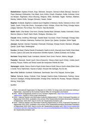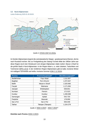 Badakhshan: Arghanj Khwah, Argo, Baharak, Darayim, Darwaz-e-Bala (Nesay), Darwaz-e- Payin (Mamay), Eshkashim, Faiz Abad, Jurm, Kishm, Khash, Khwahan, Kufab, Kohistan, Kiran wa Menjan, Raghistan, Shar-e-Buzorg, Shignan, Shiki, Shuhada, Tagab, Tashkan, Wakhan, Warduj, Yaftal-e-Sufla, Yamgan (Girwan), Yawan, Zebak Baghlan: Andarab, Baghlan-e-Jadeed (auch Baghlan-e-Markazi), Burka, Dahana-e-Ghuri, Deh Salah, Dushi, Firing Wa Gharu, Gozargah-e-Noor, Khinjan, Khost Wa Firing, Khwaja hejran (Jalga), Nahreen, Pul-e-Hisar, Pul-i-Khumri, Tala Wa Barfak Balkh: Balkh, Char Bolak, Char Kent, Chimtal, Dawlat Abad, Dehdadi, Kaldar, Kishindeh, Khulm, Marmul, Mazar-e Sharif, Nahri Shahi, Sholgara, Shortepa, Zari Faryab: Almar, Andkhoy, Bilchiragh, Dawlat Abad, Gurziwan, Khani Charbagh, Khwaja Sabz Posh-i Wali, Kohistan, Maimana, Pashtun Kot, Qaram Qul, Qaisar, Qurghan, Shirin Tagab Jawzjan: Aqchah, Darzab, Faizabad, Khamyab, Khanaqa, Khwaja Dukoh, Mardyan, Mingajik, Qarqin, Qush Tepa, Sheberghan Kunduz: Ali Abad, Chahar Darah (Chardarah), Dasht-e-Archi, (Hazrati) Imam Sahib, Khan Abad, Kunduz, Qala-e-Zal sowie die temporären Distrikte Aqtash, Calbad (Gulbad) und Gultipa Nuristan: Bargi Matal, Duab, Kamdesh, Mandol, Noor Gram, Paroon, Wama, Waygal Panjsher: Bazarak, Darah (auch Hes-e-Duwumi), Hissa-e-Awal (auch Khinj), Unaba (auch Anawa), Paryan, Rukha und Shutul sowie der temporäre Distrikt Ab Shar Samangan: Aybak, Dara-e-Soof-e-Payin [Unter-Dara-e-Soof], Dara-e-Soof-e-Bala [Ober-Dara- e-Soof], Feroz Nakhcheer, Hazrat-e-Sultan, Khuram Wa Sarbagh, Rui-Do-Ab Sar-e Pul: Balkhab, Gosfandi, Kohistanat, Sancharak, Sar-e Pul, Sayyad, Sozma Qala Takhar: Baharak, Bangi, Chahab, Chal, Darqad, Dasht-e-Qala, Eshkamesh, Farkhar, Hazar Sumuch, Kalafgan, Khwaja Bahawuddin, Khwaja Ghar, Namak Ab, Rustaq, Taluqan (Taloqan), Warsaj, Yangi Qala Quellen ■ IOM - International Organization for Migration (2.12.2024): On living costs and winterized clothing in Afghanistan, requested by the Austrian Federal Office for Immigration and Asylum ■ NPS - Naval Postgraduate School (o.D.b): Northern Afghanistan, https://nps.edu/web/ccs/northern -afghanistan, Zugriff 8.2.2024 [Login erforderlich] ■ NSIA - National Statistic and Information Authority [Afghanistan] (7.2024): Estimated Population of Afghanistan 2023-2024, availiable in the archive of the Staatendokumentation [Estimated Population of Afghanistan 2023-2024, liegt im Archiv der Staatendokumentation auf] ■ NSIA - National Statistic and Information Authority [Afghanistan] (4.2022): Estimated Population of Afghanistan 2022-2023, availiable in the archive of the Staatendokumentation [Estimated Population of Afghanistan 2022-2023, liegt im Archiv der Staatendokumentation auf], https://cloud.staatendok umentation.at/index.php/apps/files/?dir=coi-cms-archive/9b/86&fileid=04439056o [liegt im Archiv der Staatendokumentation auf] 14