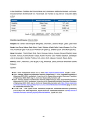 in den ländlichen Distrikten der Provinz Herat sind, dominieren städtische Handels- und Indus trieunternehmen die Wirtschaft von Herat-Stadt. Der Handel ist eng mit Iran verbunden (NPS o.D.c). Provinz Provinzhauptstadt* Bevölkerungszahl** Badghis Qala-i-Naw 579.149 Farah Farah 593.842 Herat Herat 2,283.146 Nimroz Zaranj 193.941 Quelle 4: NSIA 4.2022NSIA 4.2022*, NSIA 7.2024** Distrikte nach Provinz (NSIA 4.2022) Badghis: Ab Kamari, Bala Murghab (Murghab), Ghormach, Jawand, Muqur, Qadis, Qala-i-Naw Farah: Anar Dara, Bakwa, Bala Buluk, Farah, Gulistan, Khak-i-Safed, Lash-i-Juwayn, Pur Cha man, Pushtrud, Qala-i-Kah (auch: Pusht e Koh Qala Ka), Shibkoh (auch: Sheb Koh Qala Ka) Herat: Adraskan, Chishti Sharif, Enjil, Fersi, Ghoryan, Gulran, Guzera (Nizam-i-Shahid), Herat, Karrukh, Kohsan, Kushk (Rubat-i-Sangi), Kushk-i-Kuhna, Obe, Pashtun Zarghun, Zendahjan und die temporären Distrikte Poshtko, Koh-e-Zore (Koh-e Zawar, Kozeor), Zawol, Zerko Nimroz: Asl-e-Chakhansur, Char Burjak, Kang, Khashrod, Zaranj sowie der temporäre Distrikt Dularam Quellen ■ NPS - Naval Postgraduate School (o.D.c): Herat, https://nps.edu/web/ccs/herat, Zugriff 8.2.2024 ■ NSIA - National Statistic and Information Authority [Afghanistan] (7.2024): Estimated Population of Afghanistan 2023-2024, availiable in the archive of the Staatendokumentation [Estimated Population of Afghanistan 2023-2024, liegt im Archiv der Staatendokumentation auf] ■ NSIA - National Statistic and Information Authority [Afghanistan] (4.2022): Estimated Population of Afghanistan 2022-2023, availiable in the archive of the Staatendokumentation [Estimated Population of Afghanistan 2022-2023, liegt im Archiv der Staatendokumentation auf], https://cloud.staatendok umentation.at/index.php/apps/files/?dir=coi-cms-archive/9b/86&fileid=04439056o [liegt im Archiv der Staatendokumentation auf] ■ STDOK-OSIF - OSIF (Open Source Information)-Projekt der Staatendokumentation [Österreich] (8.9.2023b): Karte: West-Afghanistan, liegt im Archiv der Staatendokumentation auf, https://cloud.st aatendokumentation.at/index.php/s/QZHWwFdPaMffnAe, Zugriff 26.9.2023 16
