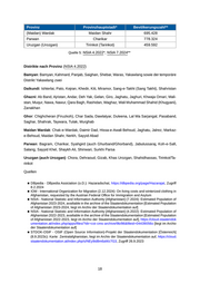 Provinz Provinzhauptstadt* Bevölkerungszahl** (Maidan) Wardak Maidan Shahr 695.428 Parwan Charikar 778.324 Uruzgan (Urozgan) Tirinkot (Tarinkot) 459.592 Quelle 5: NSIA 4.2022*, NSIA 7.2024** Distrikte nach Provinz (NSIA 4.2022) Bamyan: Bamyan, Kahmard, Panjab, Saighan, Shebar, Waras, Yakawlang sowie der temporäre Distrikt Yakawlang zwei Daikundi: Ishterlai, Pato, Kejran, Khedir, Kiti, Miramor, Sang-e-Takht (Sang Takht), Shahristan Ghazni: Ab Band, Ajristan, Andar, Deh Yak, Gelan, Giro, Jaghatu, Jaghuri, Khwaja Omari, Mali stan, Muqur, Nawa, Nawur, Qara Bagh, Rashidan, Waghaz, Wali Muhammad Shahid (Khugyani), Zanakhan Ghor: Chighcheran (Firuzkoh), Char Sada, Dawlatyar, Duleena, Lal Wa Sarjangal, Pasaband, Saghar, Shahrak, Taywara, Tulak, Murghab Maidan Wardak: Chak-e-Wardak, Daimir Dad, Hissa-e-Awali Behsud, Jaghatu, Jalrez, Markaz- e-Behsud, Maidan Shahr, Nerkh, Sayyid Abad Parwan: Bagram, Charikar, Syahgird (auch Ghurband/Ghorband), Jabulussaraj, Koh-e-Safi, Salang, Sayyid Khel, Shaykh Ali, Shinwari, Surkhi Parsa Uruzgan (auch Urozgan): Chora, Dehraoud, Gizab, Khas Urozgan, Shahidhassas, Tirinkot/Ta rinkot Quellen ■ DBpedia - DBpedia Assiciation (o.D.): Hazaradschat, https://dbpedia.org/page/Hazarajat , Zugriff 8.2.2024 ■ IOM - International Organization for Migration (2.12.2024): On living costs and winterized clothing in Afghanistan, requested by the Austrian Federal Office for Immigration and Asylum ■ NSIA - National Statistic and Information Authority [Afghanistan] (7.2024): Estimated Population of Afghanistan 2023-2024, availiable in the archive of the Staatendokumentation [Estimated Population of Afghanistan 2023-2024, liegt im Archiv der Staatendokumentation auf] ■ NSIA - National Statistic and Information Authority [Afghanistan] (4.2022): Estimated Population of Afghanistan 2022-2023, availiable in the archive of the Staatendokumentation [Estimated Population of Afghanistan 2022-2023, liegt im Archiv der Staatendokumentation auf], https://cloud.staatendok umentation.at/index.php/apps/files/?dir=coi-cms-archive/9b/86&fileid=04439056o [liegt im Archiv der Staatendokumentation auf] ■ STDOK-OSIF - OSIF (Open Source Information)-Projekt der Staatendokumentation [Österreich] (8.9.2023c): Karte: Zentralafghanistan, liegt im Archiv der Staatendokumentation auf, https://cloud. staatendokumentation.at/index.php/s/NEy9id8m6aWz7G3, Zugriff 26.9.2023 18