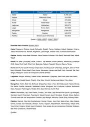 Provinz Provinzhauptstadt* Bevölkerungszahl** Kabul Kabul 5,766.181 Kapisa Mahmud-i-Raqi 514.290 Khost Khost 670.635 Kunar Asad Abad 517.180 Laghman Mehtarlam 526.271 Logar Pul-e-Alam 457.698 Nangarhar Nangarhar 1,805.087 Paktia Gardez 645.070 Paktika Sharan (auch Sharana) 816.825 Quelle 6: NSIA 4.2022*, NSIA 7.2024** Distrikte nach Provinz (NSIA 4.2022) Kabul: Bagrami, Chahar Asyab, Dehsabz, Estalef, Farza, Guldara, Kabul, Kalakan, Khak-e- Jabar, Mir Bacha Kot, Musahi, Paghman, Qara Bagh, Shakar Dara, Surubi/Surobi/Sarobi Kapisa: Alasay, Hesa Awal Kohistan, Hesa Duwum Kohistan, Koh Band, Mahmud Raqi, Nijrab, Tagab Khost: Ali Sher (Tirzayee), Baak, Gurbuz, Jaji Maidan, Khost (Matun), Manduzay (Esmayel Khil), Muza Khel, Nadir Shah Kot, Qalandar, Sabari (Yaqubi), Shamul, Spera, Tanay Kunar: Bar Kunar (auch Asmar), Chapa Dara, Sawkay (auch Chawkay), Dangam, Dara-e-Pech (auch Manogi), Ghazi Abad, Khas Kunar, Marawara, Narang wa Badil, Nari, Noorgal, Sar Kani, Shigal, Watapoor sowie der temporäre Distrikt Sheltan Laghman: Alingar, Alishing, Dawlat Shah, Mehtarlam, Qarghayi, Bad Pash (also Bad Pakh) Logar: Azra, Baraki Barak, Charkh, Khar War, Khushi, Mohammad Agha, Pul-e-Alam Nangarhar: Achin, Bati Kot, Behsud, Chaparhar, Dara-e-Nur, Deh Bala (auch Haska Mena), Dur Baba, Goshta, Hesarak, Jalalabad, Kama, Khugyani, Kot, Kuzkunar, Lalpoor, Muhmand Dara, Nazyan, Pachiragam, Rodat, Sher Zad, Shinwar, Surkh Rud Paktia: Ahmadaba, Jaji, Dand Patan, Gardez, Jani Khel, Laja Ahmad Khel (auch Laja Mangel), Samkani (auch Chamkani, Tsamkani), Sayyid Karam (auch Mirzaka), Shwak, Wuza Zadran, Zurmat sowie die vier temporären Distrikte Laja Mangel, Mirzaka, Garda Siray, Rohany Baba Paktika: Barmal, Dila Wa Khushamand, Gomal, Giyan, Jani Khel, Mata Khan, Nika (Naka), Omna, Surobi, Sar Rawzah, Sharan, Turwo, Urgoon, Wazakhwah, Wormamay, Yahya Khel, Yosuf Khel, Zarghun Shahr (auch Khairkot), Ziruk sowie die vier temporären Distrikte Shakeen, Bak Khil, Charbaran, Shakhil Abad Quellen 20