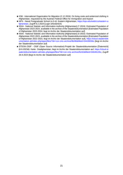■ IOM - International Organization for Migration (2.12.2024): On living costs and winterized clothing in Afghanistan, requested by the Austrian Federal Office for Immigration and Asylum ■ NPS - Naval Postgraduate School (o.D.d): Eastern Afghanistan, https://nps.edu/web/ccs/eastern-a fghanistan, Zugriff 8.2.2024 [Login erforderlich] ■ NSIA - National Statistic and Information Authority [Afghanistan] (7.2024): Estimated Population of Afghanistan 2023-2024, availiable in the archive of the Staatendokumentation [Estimated Population of Afghanistan 2023-2024, liegt im Archiv der Staatendokumentation auf] ■ NSIA - National Statistic and Information Authority [Afghanistan] (4.2022): Estimated Population of Afghanistan 2022-2023, availiable in the archive of the Staatendokumentation [Estimated Population of Afghanistan 2022-2023, liegt im Archiv der Staatendokumentation auf], https://cloud.staatendok umentation.at/index.php/apps/files/?dir=coi-cms-archive/9b/86&fileid=04439056o [liegt im Archiv der Staatendokumentation auf] ■ STDOK-OSIF - OSIF (Open Source Information)-Projekt der Staatendokumentation [Österreich] (8.9.2023d): Karte: Ostafghanistan, liegt im Archiv der Staatendokumentation auf, https://cloud.st aatendokumentation.at/index.php/apps/files/?dir=coi-cms-archive/9c/b3&fileid=04649135o, Zugriff 26.9.2023 [liegt im Archiv der Staatendokumentation auf] 21