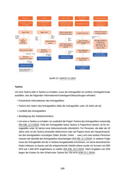Quelle 23: UNHCR 2.5.2024 Tazkira Um eine Tazkira oder e-Tazkira zu erhalten, muss der Antragsteller ein (online-) Antragsformular ausfüllen, das die folgenden Informationen/Unterlagen/Überprüfungen erfordert: • Persönliche Informationen des Antragstellers • Tazkira des Vaters des Antragstellers (falls der Antragsteller unter 18 Jahre alt ist) • Lichtbild des Antragstellers • Bestätigung des Gebietsvertreters • Um eine e-Tazkira zu erhalten, ist zusätzlich die Papier-Tazkira des Antragstellers notwendig (RA KBL 11.3.2024). Falls der Antragsteller keine Tazkira in Papierform besitzt, ist für An tragsteller unter 18 Jahren eine Geburtsurkunde erforderlich. Für Personen, die älter als 18 Jahre sind, ist die Tazkira (entweder elektronisch oder auf Papier) eines der Hauptverwand ten des Antragstellers vorzulegen (Vater, Bruder, Onkel … usw.) und zwei andere Personen müssen die Identität des Antragstellers bescheinigen (RA KBL 11.3.2024). In weiterer Folge muss der Antragsteller bei der e-Tazkira-Ausgabestelle erscheinen, um seine biometrischen Daten erfassen zu lassen und die entsprechende Gebühr (diese wurde vor Kurzem von 800 AFN auf 1.000 AFN angehoben) zu zahlen (RA KBL 19.2.2024). Nach Angaben von IOM liegen die Kosten für den Erhalt einer Tazkira bei 700 AFN (IOM 22.2.2024). 199