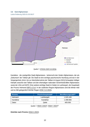 3.6 Süd-Afghanistan Letzte Änderung 2025-01-30 08:07 Quelle 7: STDOK-OSIF 8.9.2023e Kandahar - die zweitgrößte Stadt Afghanistans - beherrscht den Süden Afghanistans, der als „ Geburtsort“ der Taliban gilt. Die Stadt ist eine wichtige paschtunische Hochburg und war in der Vergangenheit, [Anm.:bis zur Machtübernahme der Taliban im August 2021],Schauplatz heftiger Kämpfe zwischen den Taliban und den ehemaligen nationalen Sicherheitskräften Afghanistans sowie der USA und NATO. Eine weitere wichtige Stadt im Süden ist Lashkargah, die Hauptstadt der Provinz Helmand (NPS o.D.e). In der südlichen Region Afghanistans sind die Winter mild und es fällt gelegentlich leichter Regen (IOM 2.12.2024). Provinz Provinzhauptstadt* Bevölkerungszahl** Helmand Lashkargah 1,525.189 Kandahar Kandahar 1,498.666 Zabul Qalat 405.050 Quelle 7: NSIA 4.2022*, NSIA 7.2024** Distrikte nach Provinz (NSIA 4.2022) 22