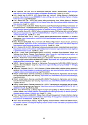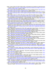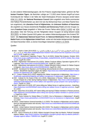 ■ 8am - Hasht-e Sobh (14.8.2022): Taliban Holds Local Residents Accountable for Any NRF Movement in Farkhar, Takhar, https://8am.media/eng/taliban-holds-local-residents-accountable-for-any-nrf-m ovement-in-farkhar-takhar , Zugriff 17.1.2023 ■ 8am - Hasht-e Sobh (13.8.2022): Taliban Arrests 20 Civilians in Baghlan Province, https://8am.medi a/eng/taliban-arrests-20-civilians-in-baghlan-province , Zugriff 17.1.2023 ■ 8am - Hasht-e Sobh (25.5.2022): A Taliban Vehicle Targeted by Magnetic Roadside Mine in Panjshir, https://8am.media/eng/a-taliban-vehicle-targeted-by-magnetic-roadside-mine-in-panjshir , Zugriff 20.12.2022 ■ 8am - Hasht-e Sobh (17.1.2022): NRF Claims to Have Killed Three Taliban Forces in Takhar, https: //8am.media/eng/nrf-claims-to-have-killed-three-taliban-forces-in-takhar , Zugriff 20.12.2022 ■ AA - Auswärtiges Amt [Deutschland] (26.6.2023): Auswärtiges Amt, Bericht über die asyl- und ab schiebungsrelevante Lage in Afghanistan - Lagefortschreibung - (Stand: Juni 2023), https://www.ec oi.net/en/document/2094871.html, Zugriff 9.8.2023 [Login erforderlich] ■ Aamaj - Aamaj News (24.8.2022): Six Taliban fighters killed and wounded as a result of the NRF forces attack on their outpost in Kapisa, https://aamajnews24.com/kapisa-22, Zugriff 17.1.2023 ■ Aamaj - Aamaj News (21.8.2022): Three Taliban fighters killed by NRF forces in Kalafgan, Takhar, https://aamajnews24.com/taliban-takhar-11, Zugriff 17.1.2023 ■ ACLED/APW - Armed Conflict Location and Event Data, Afghanistan Peace Watch (4.2022): Violence Targeting Journalists in Afghanistan (1.1.202 15.3.2022), https://www.ecoi.net/en/file/local/2071514 /ACLED_APW_JointReport_Tracking-Disorder-During-Taliban-Rule-in-Afghanistan_WebFin2022. pdf, Zugriff 5.1.2023 ■ Afintl - Afghanistan International (20.2.2024): NRF Leader Meets Head of Faction, A Just Russia, At Russian Parliament, https://www.afintl.com/en/202308299950, Zugriff 20.2.2024 ■ Afintl - Afghanistan International (8.8.2023): Killed Two Taliban Members in Guerilla Attack In Badakh shan, Claims NRF, https://www.afintl.com/en/202308086862, Zugriff 30.1.2024 ■ Afintl - Afghanistan International (5.8.2023): Killed Four Taliban Members in North of Kabul, Claims NRF, https://www.afintl.com/en/202308055568, Zugriff 30.1.2024 ■ Afintl - Afghanistan International (18.7.2023): NRF Confirms Killing Taliban Member In Baghlan, https://www.afintl.com/en/202307188086, Zugriff 24.1.2024 ■ Afintl - Afghanistan International (26.12.2022): Taliban Wages Full-Scale Attack On NRF Forces in Northern Afghanistan, https://www.afintl.com/en/202212262700, Zugriff 17.1.2023 ■ Afintl - Afghanistan International (12.12.2022): Two NRF Fighters Killed, 13 Others Wounded in Baghlan, https://www.afintl.com/en/202212129390, Zugriff 17.1.2023 ■ Afintl - Afghanistan International (11.10.2022b): National Resistance Front and IS-K Can’t Win, Says Taliban Governor, https://www.afintl.com/en/202210113330, Zugriff 17.1.2023 ■ Afintl - Afghanistan International (15.8.2022): 25 Taliban Members Killed, 40 Others Captured in Panjshir Operation, Claims NRF, https://www.afintl.com/en/202208155003, Zugriff 17.1.2023 ■ AJ - Al Jazeera (17.10.2022): US will not fund non-state actors in Afghanistan: Taliban sources, https: //www.aljazeera.com/news/2022/10/17/us-not-to-fund-other-armed-groups-in-afghanistan-taliban , Zugriff 16.1.2023 ■ AJ - Al Jazeera (14.9.2022): Taliban says 40 rebels killed in northern Afghanistan’s Panjshir, https: //www.aljazeera.com/news/2022/9/14/taliban-says-40-rebels-killed-in-northern-afghanistans-panjs hir, Zugriff 17.1.2023 ■ AMU - Amu Tv (13.12.2022): Afghanistan: Three NRF commanders captured by Taliban, https: //amu.tv/en/27600, Zugriff 17.1.2023 ■ AMU - Amu Tv (14.9.2022): Anti-Taliban forces commander, dozens more killed in Panjshir, https: //amu.tv/en/17620, Zugriff 16.1.2023 ■ AN - Arab News (18.10.2022): Report: Taliban killed captives in restive Afghan province, https: //www.arabnews.com/node/2183051/world, Zugriff 16.1.2023 ■ ANI - Asian News International (6.9.2021): National Resistance Front forces reject Taliban’s claim of occupying Panjshir, https://www.aninews.in/news/world/asia/national-resistance-front-forces-rej ect-talibans-claim-of-occupying-panjshir20210906112555/ , Zugriff 22.12.2022 ■ BAMF - Bundesamt für Migration und Flüchtlinge [Deutschland] (10.2022): Länderreport 54: Afgh anistan - Bewaffnete Opposition gegen die Taliban, https://www.ecoi.net/en/file/local/2082873/laend erreport-54-Afghanistan.pdf, Zugriff 13.1.2023 ■ BBC - British Broadcasting Corporation (16.5.2022): Afghan resistance attack Taliban, sparking reprisals in Panjshir, https://www.bbc.com/news/world-asia-61430836, Zugriff 16.1.2023 54