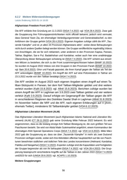 (AA 26.6.2023; vgl. LWJ 6.9.2021, ANI 6.9.2021). Die Gruppierung wird von Ahmed Massoud angeführt (REU 29.9.2023; vgl. Afintl 20.2.2024). Die NRF besteht Berichten zufolge aus Zivilisten, ehemaligen ANDSF-Mitarbeitern (SIGAR 30.4.2022; vgl. RFE/RL 13.5.2022) und ehemaligen Mitgliedern der Regierung sowie politischen Opposition (UNGA 28.1.2022). Die meisten Mitglieder der Gruppe sind ethnische Tadschiken (RFE/RL 19.5.2022; vgl. AJ 17.10.2022). Die NRF besteht auch aus mehreren regionalen Ein heiten, deren Kommandeure loyal zu Massoud sind (VOA 28.4.2022; vgl. REU 30.11.2022). Unter den Kämpfern sind auch Einheiten der ehemaligen afghanischen Armee (BBC 16.5.2022; vgl. BAMF 10.2022). Im Jahr 2022 berichteten Medien von mehreren Angriffen, die vor allem auf Kontrollpunkte und Außenposten der Taliban abzielten und der NRF zugeschrieben wurden (NYT 4.3.2022), wobei von verstärkten Kämpfen im Jänner/Februar (ACLED/APW 4.2022; vgl. 8am 25.5.2022, 8am 17.1.2022) sowie im Mai 2022 berichtet wurde (RFE/RL 19.5.2022; vgl. 8am o.D.). Aus dem Panjsher-Tal wurde berichtet, dass Angriffe auf Taliban-Stellungen regelmäßig stattfanden und Dutzende von Menschen, sowohl Taliban-Kämpfer (VOA 14.9.2022; vgl. Telegraph 12.5.2022) als auch Mitglieder der Widerstandsbewegung, getötet worden waren (VOA 14.9.2022; vgl. AMU 14.9.2022, AN 18.10.2022). Auch in der zweiten Hälfte des Jahres 2022 gingen die Kämpfe zwi schen NRF und den Taliban weiter. Zusammenstöße gibt es in den Provinzen Panjsher (Afintl 15.8.2022; vgl. AJ 14.9.2022, 8am 13.10.2022, AMU 13.12.2022), Takhar (8am 14.8.2022; vgl. Aamaj 21.8.2022, 8am 23.10.2022), Baghlan (8am 17.8.2022; vgl. KP 21.8.2022, Afintl 12.12.2022), Khost (8am 13.8.2022), Kapisa (Aamaj 24.8.2022; vgl. 8am 21.11.2022) und Bad akhshan (Afintl 11.10.2022b; vgl. AMU 13.12.2022, Afintl 26.12.2022). Auch wenn die Angriffe der NRF im Jahr 2023 im Vergleich zum Vorjahr abnahmen (UNGA 20.6.2023; vgl. UNGA 1.12.2023), kam es weiterhin zu Zusammenstößen mit den Taliban. So kam es nach Angaben der NRF zu Kämpfen beispielsweise in Baghlan (Afintl 18.7.2023; vgl. KaN 18.7.2023), Kabul (Afintl 5.8.2023), Badakhshan (KaN 8.8.2023; vgl. Afintl 8.8.2023), Parwan, Kapisa und Nuristan (KaN 8.8.2023). Im November 2023 haben die NRF und die AFF, nach eigenen Erklärungen auf X, mindestens 50 Talibankämpfer getötet (VOA 6.12.2023). Quellen ■ 8am - Hasht-e Sobh (o.D.): NRF Takeovers 10 Villages in Versaj, Takhar Province, https://8am.me dia/eng/nrf-takeovers-10-villages-in-versaj-takhar-province/ , Zugriff 17.6.2022 ■ 8am - Hasht-e Sobh (21.11.2022): Taliban Arrests 12 NRF Members in Kapisa, https://8am.media/ eng/taliban-arrests-12-nrf-members-in-kapisa , Zugriff 17.1.2023 ■ 8am - Hasht-e Sobh (23.10.2022): 8 Taliban Fighters Killed, 6 Injured in Fighting Against NRF Forces in Takhar Province, https://8am.media/eng/8-taliban-fighters-killed-6-injured-in-fighting-against-nrf -forces-in-takhar-province , Zugriff 17.1.2023 ■ 8am - Hasht-e Sobh (13.10.2022): NRF in Panjshir Claims Irreparable Damage on the Taliban, But The Taliban Rejects Ground Realities, https://8am.media/eng/nrf-in-panjshir-claims-irreparable-d amage-on-the-taliban-but-the-taliban-rejects-ground-realities , Zugriff 17.1.2023 ■ 8am - Hasht-e Sobh (17.8.2022): NRF Kills 5, Injures 4 Taliban Fighters in Baghlan Province, https: //8am.media/eng/nrf-kills-5-injures-4-taliban-fighters-in-baghlan-province , Zugriff 17.1.2023 53