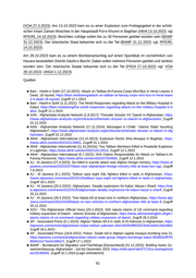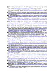 ■ BBC - British Broadcasting Corporation (18.8.2022): Afghanistan: Deadly blast rips through crowded Kabul mosque, https://www.bbc.com/news/world-asia-62581102, Zugriff 17.1.2023 ■ BBC - British Broadcasting Corporation (11.8.2022): Rahimullah Haqqani: Afghan cleric killed by bomb hidden in artificial leg - reports, https://www.bbc.com/news/world-asia-62508070 , Zugriff 17.1.2023 ■ DW - Deutsche Welle (21.4.2022): Afghanistan: Deadly bomb attack hits mosque in Mazar-e-Sharif, https://www.dw.com/en/afghanistan-deadly-bomb-attack-hits-mosque-in-mazar-e-sharif/a-61536 759, Zugriff 20.12.2022 ■ EB - Encyclopaedia Britannica (3.1.2023): Islamic State in Iraq and the Levant, https://www.brit annica.com/topic/Islamic-State-in-Iraq-and-the-Levant/ISIL-outside-of-Iraq-and-Syria , Zugriff 10.1.2023 ■ FR24 - France 24 (27.10.2023): Islamic State jihadist group claims deadly blast in Kabul sports club, https://www.france24.com/en/asia-pacific/20231027-islamic-state-jihadist-group-claims-deadly-bla st-in-kabul, Zugriff 31.1.2024 ■ FR24 - France 24 (1.5.2022): Islamic State group claims responsibility for Kabul bus bombing, https://www.france24.com/en/middle-east/20220501-the-islamic-state-claims-responsability-for-b us-bombing-in-afghan-capital , Zugriff 12.1.2023 ■ HRW - Human Rights Watch (12.1.2023): World Report 2023 - Afghanistan, https://www.ecoi.net/e n/document/2085369.html, Zugriff 18.1.2023 ■ ICCT - International Centre for Counter-Terrorism (30.1.2024): The Islamic State in Khorasan between Taliban counter-terrorism and resurgence prospects, https://www.icct.nl/publication/islamic- state-khorasan-between-taliban-counter-terrorism-and-resurgence-prospects?utm_source=ICCT Updates&utm_campaign=b7725496a8-EMAIL_CAMPAIGN_2021_06_12_02_06_COPY_06&utm_- medium=email&utm_term=0_e742a7c20c-b7725496a8-546519632, Zugriff 28.2.2024 ■ KP - Khaama Press (6.9.2022): Deadly Suicide Attack Outside Russian Embassy in Kabul: ISIS Takes Responsibility - The Khaama Press News Agency, https://www.khaama.com/deadly-suicide -attack-outside-russian-embassy-in-kabul-isis-takes-responsibility-35768 , Zugriff 12.1.2023 ■ KP - Khaama Press (16.10.2021): ISIS claims responsibility for Kandahar mosque blasts - The Khaama Press News Agency, https://www.khaama.com/isis-claims-responsibility-for-kandahar-m osque-blasts-45647, Zugriff 12.1.2023 ■ LWJ - Long War Journal (5.3.2015): Mapping the emergence of the Islamic State in Afghanistan, https://www.longwarjournal.org/archives/2015/03/mapping-the-emergence-of-the-islamic-state-i n-afghanistan.php, Zugriff 22.12.2022 ■ MEE - Middle East Eye (27.8.2021): Afghanistan: What links do IS-K have to the Middle East?, https://www.middleeasteye.net/news/afghanistan-who-islamic-state-khorasan-province-and-wha t-are-their-aims , Zugriff 22.12.2022 ■ PAN - Pajhwok Afghan News (23.4.2022): Last week deadliest since regime change last year, https: //pajhwok.com/2022/04/23/last-week-deadliest-since-regime-change-last-year/ , Zugriff 20.12.2022 ■ REU - Reuters (1.1.2023): Blast outside Kabul’s military airport, multiple casualties, interior ministry says, https://www.reuters.com/world/asia-pacific/blast-outside-kabuls-military-airport-multiple-cas ualties-feared-interior-2023-01-01 , Zugriff 18.1.2023 ■ REU - Reuters (22.10.2022): Taliban kill six Islamic State members in raid in Kabul, https://www.re uters.com/world/asia-pacific/taliban-kill-six-islamic-state-members-raid-afghan-capital-spokesman -2022-10-22 , Zugriff 17.1.2023 ■ REU - Reuters (5.8.2022): Blast in Kabul, Afghanistan kills 8; Islamic State claims responsibility, https: //www.reuters.com/world/asia-pacific/blast-hits-afghanistans-capital-kabul-official-2022-08-05 , Zugriff 17.1.2023 ■ REU - Reuters (4.10.2021a): Taliban say forces destroy Islamic State cell hours after Kabul blast, https://www.reuters.com/world/asia-pacific/taliban-say-forces-destroy-islamic-state-cell-hours-after -kabul-blast-2021-10-04 , Zugriff 12.1.2023 ■ RFE/RL - Radio Free Europe/Radio Liberty (14.10.2023): Islamic State Claims Responsibility For Deadly Suicide Bombing At Mosque In Afghanistan, https://www.rferl.org/a/afghanistan-shiite-mos que-bombing-islamic-state-responsibility/32637481.html , Zugriff 31.1.2024 ■ RFE/RL - Radio Free Europe/Radio Liberty (1.1.2023): Several Killed, Injured In Blast At Kabul’s Military Airport, https://www.rferl.org/a/afghanistan-blast-military-airport/32202981.html , Zugriff 18.1.2023 ■ TN - Tolonews (18.6.2022): Attack on Gurdwara in Kabul Faces Strong Reactions, https://tolonews .com/afghanistan-178538, Zugriff 12.1.2023 62