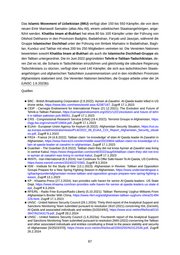 Das Islamic Movement of Uzbekistan (IMU) verfügt über 150 bis 550 Kämpfer, die von dem neuen Emir Mamasoli Samatov (alias Abu Ali), einem usbekischen Staatsangehörigen, ange führt werden. Khatiba Imam al-Bukhari hat etwa 80 bis 100 Kämpfer unter der Führung von Dilshod Dekhanov in den Provinzen Badghis, Badakhshan, Faryab und Jawzjan, während die Gruppe Islamischer Dschihad unter der Führung von Ilimbek Mamatov in Badakhshan, Bagh lan, Kunduz und Takhar mit etwa 200 bis 250 Mitgliedern vertreten ist. Die Vereinten Nationen bewerteten sowohl Khatiba Imam al-Bukhari als auch die Islamische Dschihad-Gruppe als den Taliban untergeordnet. Die im Juni 2022 gegründeten Tehrik-e-Taliban-Tadschikistan, de ren Ziel es ist, die Scharia in Tadschikistan einzuführen und gleichzeitig die säkulare Regierung Tadschikistans zu stürzen, verfügt über rund 140 Kämpfer, die sich aus tadschikischen Staats angehörigen und afghanischen Tadschiken zusammensetzen und in den nördlichen Provinzen Afghanistans stationiert sind. Die Vereinten Nationen berichten, die Gruppe arbeite unter der JA (UNSC 1.6.2023b). Quellen ■ BBC - British Broadcasting Corporation (2.8.2022): Ayman al-Zawahiri: Al-Qaeda leader killed in US drone strike, https://www.bbc.com/news/world-asia-62387167, Zugriff 17.1.2023 ■ CEIP - Carnegie Endowment for International Peace (21.12.2021): The Evolution and Future of Tehrik-e-Taliban Pakistan, https://carnegieendowment.org/2021/12/21/evolution-and-future-of-tehri k-e-taliban-pakistan-pub-86051 , Zugriff 17.1.2023 ■ CRS - Congressional Research Service [USA] (19.4.2022): Terrorist Groups in Afghanistan, https: //sgp.fas.org/crs/row/IF10604.pdf, Zugriff 17.1.2023 ■ EUAA - European Union Agency for Asylum (8.2022): Afghanistan Security Situation, https://coi.eu aa.europa.eu/administration/easo/PLib/2022_08_EUAA_COI_Report_Afghanistan_Security_situati on.pdf, Zugriff 9.1.2023 ■ FR24 - France 24 (4.8.2022): Taliban claim ’no knowledge’ of slain Al Qaeda leader Al-Zawahiri in Afghanistan, https://www.france24.com/en/middle-east/20220804-taliban-claim-no-knowledge-of-s lain-al-qaeda-leader-al-zawahiri-in-afghanistan , Zugriff 17.1.2023 ■ Guardian - The Guardian (5.8.2022): Taliban claim they did not know Ayman al-Zawahiri was living in central Kabul, https://www.theguardian.com/world/2022/aug/04/taliban-claim-they-did-not-kno w-ayman-al-zawahiri-was-living-in-central-kabul , Zugriff 17.1.2023 ■ IRINTL - Iran International (8.3.2024): Iran Continues To Offer Safe Haven To Al-Qaeda, US Confirms, https://www.iranintl.com/en/202402273383, Zugriff 8.3.2024 ■ ISW - Institute for the Study of War (13.1.2023): Afghanistan in Review: Taliban and Opposition Groups Prepare for a New Spring Fighting Season in Afghanistan, https://www.understandingwar.o rg/backgrounder/afghanistan-review-taliban-and-opposition-groups-prepare-new-spring-fighting-s eason, Zugriff 13.1.2023 ■ KP - Khaama Press (27.2.2024): Iran provides safe haven for senior Al-Qaeda leaders: US State Dept, https://www.khaama.com/iran-provides-safe-haven-for-senior-al-qaeda-leaders-us-state-d ept, Zugriff 8.3.2024 ■ RFE/RL - Radio Free Europe/Radio Liberty (5.10.2021): Taliban ’Removing’ Uyghur Militants From Afghanistan’s Border With China, https://www.rferl.org/a/afghanistan-taliban-uyghurs-china/31494 226.html, Zugriff 17.1.2023 ■ UNSC - United Nations Security Council (29.1.2024): Thirty-third report of the Analytical Support and Sanctions Monitoring Team submitted pursuant to resolution 2610 (2021) concerning ISIL (Da’esh), Al-Qaida and associated individuals and entities [S/2024/92], https://www.ecoi.net/en/file/local/210 3947/N2343179.pdf, Zugriff 28.2.2024 ■ UNSC - United Nations Security Council (1.6.2023a): Fourteenth report of the Analytical Support and Sanctions Monitoring Team submitted pursuant to resolution 2665 (2022) concerning the Taliban and other associated individuals and entities constituting a threat to the peace stability and security of Afghanistan [S/2023/370], https://www.ecoi.net/en/file/local/2093255/N2312536.pdf , Zugriff 26.2.2024 67