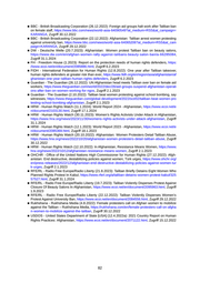 ■ BBC - British Broadcasting Corporation (26.12.2022): Foreign aid groups halt work after Taliban ban on female staff, https://www.bbc.com/news/world-asia-64090549?at_medium=RSS&at_campaign= KARANGA, Zugriff 30.12.2022 ■ BBC - British Broadcasting Corporation (22.12.2022): Afghanistan: Taliban arrest women protesting against university ban, https://www.bbc.com/news/world-asia-64065206?at_medium=RSS&at_cam paign=KARANGA, Zugriff 29.12.2022 ■ DW - Deutsche Welle (20.7.2023): Afghanistan: Women protest Taliban ban on beauty salons, https://www.dw.com/en/afghan-women-rally-against-talibans-beauty-salon-ban/a-66285084 , Zugriff 31.1.2024 ■ FH - Freedom House (1.2023): Report on the protection needs of human rights defenders, https: //www.ecoi.net/en/document/2085886.html, Zugriff 6.2.2023 ■ FIDH - International Federation for Human Rights (12.8.2022): One year after Taliban takeover, human rights defenders at greater risk than ever, https://www.fidh.org/en/region/asia/afghanistan/af ghanistan-one-year-taliban-human-rights-defenders , Zugriff 6.2.2023 ■ Guardian - The Guardian (26.12.2022): UN Afghanistan head meets Taliban over ban on female aid workers, https://www.theguardian.com/world/2022/dec/26/aid-groups-suspend-afghanistan-operati ons-after-ban-on-women-working-for-ngos , Zugriff 2.1.2023 ■ Guardian - The Guardian (2.10.2022): Taliban beat women protesting against school bombing, say witnesses, https://www.theguardian.com/global-development/2022/oct/02/taliban-beat-women-pro testing-school-bombing-afghanistan , Zugriff 2.1.2023 ■ HRW - Human Rights Watch (11.1.2024): World Report 2024 - Afghanistan, https://www.ecoi.net/e n/document/2103130.html, Zugriff 17.1.2024 ■ HRW - Human Rights Watch (30.11.2023): Women’s Rights Activists Under Attack in Afghanistan, https://www.hrw.org/news/2023/11/30/womens-rights-activists-under-attack-afghanistan , Zugriff 31.1.2024 ■ HRW - Human Rights Watch (12.1.2023): World Report 2023 - Afghanistan, https://www.ecoi.net/e n/document/2085369.html, Zugriff 18.1.2023 ■ HRW - Human Rights Watch (20.10.2022): Afghanistan: Women Protesters Detail Taliban Abuse, https://www.hrw.org/news/2022/10/20/afghanistan-women-protesters-detail-taliban-abuse , Zugriff 30.12.2022 ■ HRW - Human Rights Watch (12.10.2022): In Afghanistan, Resistance Means Women, https://www. hrw.org/news/2022/10/12/afghanistan-resistance-means-women , Zugriff 2.1.2023 ■ OHCHR - Office of the United Nations High Commissioner for Human Rights (27.12.2022): Afgh anistan: End destructive, destabilizing policies against women, Türk urges, https://www.ohchr.org/ en/press-releases/2022/12/afghanistan-end-destructive-destabilizing-policies-against-women-tur k-urges, Zugriff 2.1.2023 ■ RFE/RL - Radio Free Europe/Radio Liberty (21.8.2023): Taliban Briefly Detains Eight Women Who Planned Rights Protest In Kabul, https://www.rferl.org/a/taliban-detains-women-protest-kabul/325 57527.html, Zugriff 31.1.2024 ■ RFE/RL - Radio Free Europe/Radio Liberty (19.7.2023): Taliban Violently Disperses Protest Against Closure Of Beauty Salons In Afghanistan, https://www.ecoi.net/en/document/2095963.html, Zugriff 1.9.2023 ■ RFE/RL - Radio Free Europe/Radio Liberty (22.12.2022): Taliban Violently Disperses Women’s Protest Against University Ban, https://www.ecoi.net/en/document/2084556.html, Zugriff 29.12.2022 ■ Rukhshana - Rukhshana Media (4.8.2022): Female protesters call on Afghan women to mobilize against the Taliban – Rukhshana Media, https://rukhshana.com/en/female-protesters-call-on-afgha n-women-to-mobilize-against-the-taliban , Zugriff 30.12.2022 ■ USDOS - United States Department of State [USA] (12.4.2022a): 2021 Country Report on Human Rights Practices: Afghanistan, https://www.ecoi.net/en/document/2071122.html, Zugriff 15.12.2022 82