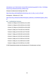 Informationen zum E-Mail-Verkehr mit dem BMI (Kundmachung gemäß § 13 Abs. 2 AVG)https: //www.bmi.gv.at/Impressum/email_richtlinien.aspx Hinweise für elektronische Anbringen (96,7 KB) https://www.bfa.gv.at/Kontakt/files/Kundmachung_nach_13_Abs_2_und_5_AVG.pdf Amtssignatur – Bildmarke (117,7 KB) https://www.bfa.gv.at/Impressum/files/Amtssignatur_Bildmarke_Veroeffentlichungstext_2020.p df 26.3 Veröffentlichte Versionen • Version 12, Gültig von 16-10-2023 bis 15-11-2024 • Version 11, Gültig von 20-04-2023 bis 16-10-2023 • Version 10, Gültig von 24-08-2022 bis 20-04-2023 • Version 9, Gültig von 07-04-2022 bis 24-08-2022 • Version 8, Gültig von 06-10-2021 bis 07-04-2022 • Version 7, Gültig von 02-06-2021 bis 06-10-2021 • Version 6, Gültig von 24-02-2021 bis 02-06-2021 • Version 5, Gültig von 02-12-2020 bis 24-02-2021 • Version 4, Gültig von 13-11-2020 bis 02-12-2020 • Version 3, Gültig von 02-10-2020 bis 13-11-2020 © 2025 Staatendokumentation des Bundesamtes für Fremdenwesen und Asyl 52