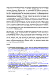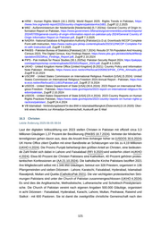 ■ USDOS - United States Department of State [USA] (30.6.2024): 2023 Report on International Reli gious Freedom - Pakistan, https://www.state.gov/reports/2023-report-on-international-religious-fre edom/pakistan, Zugriff 2.10.2024 ■ USDOS - United States Department of State [USA] (23.4.2024): 2023 Country Reports on Human Rights Practices Pakistan, https://www.state.gov/reports/2023-country-reports-on-human-rights-p ractices/pakistan/, Zugriff 24.4.2024 16.2 Ahmadis Letzte Änderung 2025-06-05 08:04 Beim digitalen Zensus von 2023 registrierten sich aufgerundet 163.000 Menschen als Ahma dis. Offiziell machen Ahmadis damit 0,07 Prozent der pakistanischen Bevölkerung aus (PAKBS 18.7.2024). Minderheitenvertreter argumentieren, ihre tatsächliche Zahl sei unterrepräsentiert. Speziell Ahmadis stehen in dieser Hinsicht vor der Schwierigkeit, dass sie bei der Registrierung, ihren Gründer entweder als falschen Propheten angeben müssen, oder sich dezidiert als Nicht- Muslime erklären müssen (USDOS 30.6.2024). Viele Ahmadis boykottieren dementsprechend den Zensus. Außerdem wird berichtet, dass sich viele Ahmadis öffentlich nicht als solche zu erkennen geben, aus Sorge vor gesellschaftlicher Diskriminierung oder Gewalt (BAMF 11.2023). Es gibt somit keine verlässlichen Daten zur Anzahl der Ahmadis in Pakistan. Die Schätzungen über die Anzahl der Anhänger der Ahmadiyya Muslim Jamaat, der Hauptströmung dieses Glau bens, reichen von 500.000 bis hin zur älteren Eigenangabe von bis zu 5 Millionen Mitgliedern. Die Mitgliederzahl der kleineren Lahore-Gruppe [Anmerkung: Ahmadiya Anjuman Ischaʽat-i-Islam Lahore] in Pakistan wird auf rund 5.000 bis 10.000 Anhänger geschätzt. Das Zentrum der Ah madis in Pakistan befindet sich in Rabwah, offiziell Chenab Nagar benannt. Ungefähr 90 bis 95 Prozent der Einwohner der Stadt, circa 60.000 bis 70.000 Menschen, sind Ahmadis (BAMF 11.2023; vgl. UKHO 9.2021). Weitere Siedlungszentren der Ahmadis befinden sich in Sialkot, Quetta, Multan, Rawalpindi, Karatschi, Lahore und Faisalabad sowie in Peschawar, Khewra, Sarghoda, Bhalwal, Shahpur und Gujranwala (UKHO 9.2021). Durch eine Änderung der Verfassung im Jahr 1974 wurden Ahmadis zu Nicht-Muslimen er klärt (USCIRF 5.2024). Außerdem wurden einige gesetzliche Regelungen eingeführt, die sich spezifisch gegen ihre Religionsgemeinschaft richten (HRW 16.1.2025). Seit 1984 legt das Paki stanische Strafgesetzbuch unter den Paragrafen 298b und 298c für diese Religionsgemeinschaft ein Verbot nieder, sich als Muslime bezeichnen. Damit ist es für Ahmadis auch verboten, ihre Gebetshäuser als Moscheen zu bezeichnen, aus dem Koran oder den Hadithen zu zitieren, Tex te aus dem Koran auszustellen und ihre Glaubensschriften zu drucken, zu erwerben (USCIRF 5.2024 vgl. AA 21.10.2024), zu verkaufen oder zu veröffentlichen. Das Strafgesetz formuliert auch, dass sie nicht so „ tun dürfen“, als wären sie Muslime, womit sie auch keine Formulierun gen wie Anhänger des Islams oder islamische Begriffe und Bräuche anwenden dürfen. Auch das Propagieren ihrer Religion oder die Missionierung sind verboten. Ein Verstoß gegen die se Bestimmungen ist mit bis zu drei Jahren Haft und einer Strafzahlung sanktioniert (USDOS 30.6.2024; vgl. AA 21.10.2024). Bei der Durchführung von muslimischen Riten, wie den Opfe rungen zu Eid-al-Azha, kommt es ebenfalls immer wieder zu Anzeigen und Verhaftungen. 36 Ahmadis wurden deshalb 2024 verhaftet (HRCP 26.2.2025). Außerdem gibt es Berichte, wonach 117