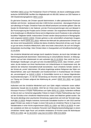 ■ HRW - Human Rights Watch (16.1.2025): World Report 2025: Rights Trends in Pakistan, https: //www.hrw.org/world-report/2025/country-chapters/pakistan#ce2d83, Zugriff 12.2.2025 ■ MBZ - Außenministerium der Niederlande [Niederlande] (5.7.2024a): General Country of Origin In formation Report on Pakistan, https://www.government.nl/binaries/government/documenten/reports/ 2024/07/05/general-country-of-origin-information-report-on-pakistan-july-2024/General Country of Origin Information Report on Pakistan.pdf, Zugriff 7.3.2025 ■ NADRA - National Database & Registration Authority [Pakistan] (o.D.a): Downloads NICOP Complete Form with Instruction, https://www.nadra.gov.pk/wp-content/uploads/2023/12/NICOP-Complete-For m-with-Instruction.pdf, Zugriff 7.3.2025 ■ PAKBS - Pakistan Bureau of Statistics [Pakistan] (18.7.2024): Results Of 7th Population And Housing Census-2023, The Digital Census, Key Findings Report, https://www.pbs.gov.pk/sites/default/files/p opulation/2023/Key_Findings_Report.pdf, Zugriff 2.10.2024 ■ PIPS - Pak Institute for Peace Studies (30.1.2025a): Pakistan Security Report 2024, https://pakpips. com/app/reports/wp-content/uploads/2025/01/Report_2024.pdf, Zugriff 4.3.2025 ■ UKHO - United Kingdom Home Office [United Kingdom] (9.2021): Country Policy and Information Note Pakistan: Ahmadis, https://www.ecoi.net/en/file/local/2059923/PAK_CPIN_Ahmadis.pdf , Zugriff 9.10.2024 ■ USCIRF - United States Commission on International Religious Freedom [USA] (5.2024): United States Commission on International Religious Freedom 2024 Annual Report - Pakistan, https://ww w.ecoi.net/en/file/local/2111601/Pakistan.pdf, Zugriff 27.9.2024 ■ USDOS - United States Department of State [USA] (30.6.2024): 2023 Report on International Reli gious Freedom - Pakistan, https://www.state.gov/reports/2023-report-on-international-religious-fre edom/pakistan, Zugriff 2.10.2024 ■ USDOS - United States Department of State [USA] (23.4.2024): 2023 Country Reports on Human Rights Practices Pakistan, https://www.state.gov/reports/2023-country-reports-on-human-rights-p ractices/pakistan/, Zugriff 24.4.2024 ■ VB Islamabad - Verbindungsbeamt*in des BMI in Islamabad/Bangkok [Österreich] (3.10.2020): Über tritt eines Moslems zur Ahmadiya-Gemeinschaft, Auskunft per E-Mail 16.3 Christen Letzte Änderung 2025-06-05 08:04 Laut der digitalen Volkszählung von 2023 stellen Christen in Pakistan mit offiziell circa 3,3 Millionen Gläubigen 1,37 Prozent der Bevölkerung (PAKBS 18.7.2024). Vertreter der Minderhei tenreligionen gehen davon aus, dass die Anzahl ihrer Anhänger höher ist (USDOS 30.6.2024). UK Home Office zitiert Quellen mit einer Bandbreite an Schätzungen von bis zu 4,19 Millionen (UKHO 4.2024). Die Provinz Punjab beherbergt den größten Anteil an Christen, eine bedeuten de Zahl findet sich dabei in Lahore und Faisalabad (RFI 9.2020;wird weiterhin zitiert inUKHO 4.2024). Etwa 60 Prozent der Christen Pakistans sind Katholiken, 40 Prozent gehören protes tantischen Konfessionen an (AA 21.10.2024). Die katholische Kirche Pakistans beziffert 2021 ihre Mitgliederzahl selbst mit 1.348.950 Gläubigen, betreut von 328 Priestern, organisiert in 136 Pfarrgemeinden und sieben Diözesen - Lahore, Karatschi, Faisalabad, Hyderabad, Islamabad- Rawalpindi, Multan und Quetta (CatholicsPak 2021). Die vier wichtigsten protestantischen Strö mungen Pakistans sind unter der Church of Pakistan zusammengeschlossen (UKHO 4.2024). Es sind dies die Anglikanische, Methodistische, Lutheranische und Schottisch-Presbyteriani sche. Die Church of Pakistan vereint nach eigenen Angaben 500.000 Gläubige, organisiert in acht Diözesen - Faisalabad, Hyderabad, Karachi, Lahore, Multan, Peshawar, Raiwind und Sialkot - mit 600 Pastoren. Sie ist damit die zweitgrößte christliche Gemeinschaft nach den 121
