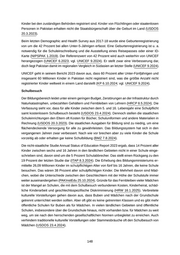 Kinder bei den zuständigen Behörden registriert sind. Kinder von Flüchtlingen oder staatenlosen Personen in Pakistan erhalten nicht die Staatsbürgerschaft über die Geburt im Land (USDOS 20.3.2023). Beim letzten Demographic and Health Survey aus 2017-18 wurde eine Geburtenregistrierung von um die 42 Prozent bei allen Unter-5-Jährigen erfasst. Eine Geburtenregistrierung ist u. a. notwendig für die Schuleinschreibung und die Ausstellung eines Reisepasses oder einer ID- Karte (NIPSPAK 1.2019). Der Referenzwert von 42 Prozent wird auch weiterhin von UNICEF herangezogen (UNICEF 6.2023; vgl. UNICEF 9.2024). Er stellt zwar eine Verbesserung dar, doch liegt Pakistan damit im regionalen Vergleich in Südasien an letzter Stelle (UNICEF 9.2024). UNICEF geht in seinem Bericht 2023 davon aus, dass 60 Prozent aller Unter-Fünfjährigen und insgesamt 60 Millionen Kinder in Pakistan nicht registriert sind, was die größte Anzahl nicht registrierter Kinder weltweit in einem Land darstellt (KP 6.10.2024; vgl. UNICEF 9.2024). Schulbesuch Der Bildungsbereich leidet unter einem geringen Budget, Zerstörungen an der Infrastruktur durch Naturkatastrophen, unbezahlten Gehältern und Fernbleiben von Lehrern (HRCP 8.5.2024). Die Verfassung sieht vor, dass für alle Kinder zwischen dem 5. und 16. Lebensjahr eine Schulpflicht samt kostenlosem Schulbesuch besteht (USDOS 23.4.2024). Dennoch stellen die staatlichen Schuleinrichtungen den Eltern oft Kosten für Bücher, Schuluniformen und andere Materialien in Rechnung (USDOS 20.3.2023). Die staatlichen Ausgaben für Bildung sind zu niedrig, um eine flächendeckende Versorgung für alle zu gewährleisten. Das Bildungssystem hat sich in den vergangenen Jahren zwar verbessert. Nach wie vor brechen aber zu viele Kinder die Schule vorzeitig ab oder erhalten gar keine Schulbildung (BMZ 7.8.2024). Die nicht-staatliche Studie Annual Status of Education Report 2023 ergab, dass 14 Prozent aller Kinder zwischen sechs und 16 Jahren in den ländlichen Gebieten nicht in einer Schule einge schrieben sind, davon sind um die 5 Prozent Schulabbrecher. Das stellt einen Rückgang zu den 19 Prozent der letzten Studie dar (ITAP 8.3.2024). Die Erhebung des Bildungsministeriums er mittelte 26,09 Millionen Kinder im schulpflichtigen Alter von fünf bis 16 Jahren, die keine Schule besuchen. Das wären 38 Prozent aller schulpflichtigen Kinder. Die Mehrheit davon sind Mäd chen, wobei die Unterschiede zwischen den Geschlechtern mit der Höhe der Schulstufe immer weiter auseinandergehen (PAKInstEdu 25.10.2024). Gründe für das Fernbleiben vieler Mädchen ist der Mangel an Schulen, die mit dem Schulbesuch verbundenen Kosten, Kinderheirat, schäd liche Kinderarbeit und geschlechtsspezifische Diskriminierung (HRW 16.1.2025). Verbreitete kulturelle Vorstellungen gehen davon aus, dass Buben und Mädchen nach der Grundschule getrennt unterrichtet werden sollten. Aber oft gibt es keine getrennten Klassen und es gibt mehr öffentliche Schulen für Buben als für Mädchen. In vielen ländlichen Gebieten sind öffentliche Schulen, insbesondere über die Grundschule hinaus, nicht vorhanden bzw. für Mädchen zu weit weg, um sie nach den herrschenden gesellschaftlichen Normen unbegleitet zu erreichen. Auch verhindern traditionelle kulturelle Vorstellungen oder Stammesbräuche oft den Schulbesuch von Mädchen (USDOS 23.4.2024). 148