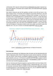 und November 2022 zeigt eine Verdreizehnfachung (IOM/UNHCR 29.11.2023). Insgesamt wur den 23.804 Afghanen im November 2023 verhaftet, davon 1.872 PoR-Karteninhaber (UNHCR/ IOM 10.11.2024). Nach diesem Höhepunkt sank die Zahl signifikant und blieb im Jahr 2024 auf einem im Ver gleich niedrigen Niveau. Im November 2024 kündigte der Innenminister allerdings an, dass alle afghanischen Staatsbürger ein No-Objection Certificate (NOC) benötigen, um nach dem 31. Dezember 2024 im Hauptstadtterritorium Islamabad bleiben zu können. In Folge stieg bereits im Dezember die Zahl der Verhaftungen im Vergleich zum Vormonat um 80 Prozent auf 2.058 Personen. Davon entfielen mit 1.180 an der Zahl 35 Prozent auf Islamabad. Allerdings waren auch schon im November die Zahlen gestiegen (UNHCR/IOM 10.1.2025). Amnesty Internatio nal berichtet daraufhin, dass in der Woche nach Inkrafttreten zwischen 1. und 8. Jänner 2025 mehr als 800 Afghanen in Islamabad verhaftet wurden (AI 8.1.2025). Laut UNHCR wurden 285 Afghanen vom 1. bis zum 15. Jänner von Islamabad abgeschoben (VOA 16.1.2025). Quelle 12: UNHCR/IOM 10.1.2025Verhaftungen von Afghanen Monatsweise Abschiebungen Die Zahl der Abschiebungen nach Afghanistan hatte sich bereits nach der Machtübernahme der Taliban in Afghanistan erhöht. Direkt im Folgezeitraum wurden zwischen September und Oktober 2021 laut UNHCR 1.800 Personen zurückgeführt (UNHCR 22.12.2021). Die Abschiebungen gingen daraufhin zurück auf 1.740 Personen im gesamten Jahr 2022 (IOM 7.3.2023). Ab Jänner 2023 nahm die Zahl der Abschiebungen wieder stark zu (VB Islamabad 27.2.2023). Auch Frauen und Kinder waren betroffen (Guardian 10.1.2023). Nach der Verkündung des Repatriierungsplanes registrierte IOM für den Monat Oktober 2023 - also noch vor Ablauf der Deadline zur freiwilligen Ausreise - 959 Abschiebungen. Vom 1. bis zum 30. November verzeichnete UNHCR schließlich 24.506 Abschiebungen (UNHCR 23.10.2024). Im Erhebungszeitraum vor der Ankündigung des Plans von 1. bis 15. September wurden zum Vergleich 228 Afghanen abgeschoben (IOM 22.9.2023). 170