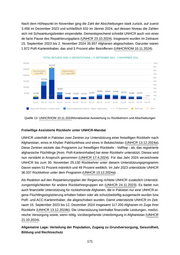 Nach dem Höhepunkt im November ging die Zahl der Abschiebungen stark zurück, auf zuerst 3.458 im Dezember 2023 und schließlich 632 im Jänner 2024, auf dessen Niveau die Zahlen sich mit Schwankungsbreiten einpendelte. Dementsprechend schreibt UNHCR auch von einer de facto Pause des Repatriierungsplans (UNHCR 23.10.2024). Insgesamt wurden im Zeitraum 15. September 2023 bis 2. November 2024 35.957 Afghanen abgeschoben. Darunter waren 1.972 PoR-Karteninhaber, das sind 5 Prozent aller Betroffenen (UNHCR/IOM 10.11.2024). Quelle 13: UNHCR/IOM 10.11.2024Monatsweise Auswertung zu Rückkehrern und Abschiebungen Freiwillige Assistierte Rückkehr unter UNHCR-Mandat UNHCR unterhält in Pakistan zwei Zentren zur Unterstützung einer freiwilligen Rückkehr nach Afghanistan, eines in Khyber Pakhtunkhwa und eines in Belutschistan (UNHCR 13.12.2024a). Diese Zentren wickeln das Programm zur freiwilligen Rückkehr - VolRep - ab, das registrierte afghanische Flüchtlinge [Anm. PoR-Karteninhaber] bei einer Rückkehr unterstützt. Dieses wird nun verstärkt in Anspruch genommen (UNHCR 17.4.2024). Für das Jahr 2024 verzeichnete UNHCR bis zum 30. November 25.130 Rückkehrer unter diesem Unterstützungsprogramm. Davon waren 51 Prozent männlich und 49 Prozent weiblich. Im Jahr 2023 unterstützte UNHCR 36.337 Rückkehrer unter dem Programm (UNHCR 13.12.2024a). Als Reaktion auf den Repatriierungsplan der Regierung richtete UNHCR zusätzlich Unterstüt zungsmöglichkeiten für andere Rückkehrergruppen ein (UNHCR 24.11.2023). Es bietet nun auch finanzielle Unterstützung für rückkehrende Afghanen, die in Pakistan nur eine UNHCR-ei gene Flüchtlingsregistrierung erhalten haben oder als schutzbedürftig ausgemacht wurden bzw. PoR- und ACC-Karteninhaber, die abgeschoben wurden. Damit unterstützte UNHCR im Zeit raum 15. September 2023 bis 12. Dezember 2024 insgesamt 117.200 Afghanen im Zuge ihrer Rückkehr (UNHCR 13.12.2024b). Die Unterstützung beinhaltet finanzielle Leistungen, medizi nische Versorgung sowie, wenn nötig, vorübergehende Unterbringung in Afghanistan (UNHCR 21.10.2024). Allgemeine Lage: Verteilung der Population, Zugang zu Grundversorgung, Gesundheit, Bildung und Rechtsschutz 171