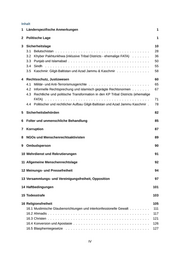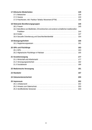 Inhalt 1 Länderspezifische Anmerkungen 1 2 Politische Lage 1 3 Sicherheitslage 10 3.1 Belutschistan . . . . . . . . . . . . . . . . . . . . . . . . . . . . . . . . . . . . . 28 3.2 Khyber Pakhtunkhwa (inklusive Tribal Districts - ehemalige FATA) . . . . . . . 36 3.3 Punjab und Islamabad . . . . . . . . . . . . . . . . . . . . . . . . . . . . . . . . 50 3.4 Sindh . . . . . . . . . . . . . . . . . . . . . . . . . . . . . . . . . . . . . . . . . 55 3.5 Kaschmir: Gilgit-Baltistan und Azad Jammu & Kaschmir . . . . . . . . . . . . . 58 4 Rechtsschutz, Justizwesen 60 4.1 Militär- und Anti-Terrorismusgerichte . . . . . . . . . . . . . . . . . . . . . . . . 65 4.2 Informelle Rechtsprechung und islamisch geprägte Rechtsnormen . . . . . . . 67 4.3 Rechtliche und politische Transformation in den KP Tribal Districts (ehemalige FATA) . . . . . . . . . . . . . . . . . . . . . . . . . . . . . . . . . . . . . . . . . 71 4.4 Politischer und rechtlicher Aufbau Gilgit-Baltistan und Azad Jammu Kaschmir . 78 5 Sicherheitsbehörden 82 6 Folter und unmenschliche Behandlung 85 7 Korruption 87 8 NGOs und Menschenrechtsaktivisten 89 9 Ombudsperson 90 10 Wehrdienst und Rekrutierungen 91 11 Allgemeine Menschenrechtslage 92 12 Meinungs- und Pressefreiheit 94 13 Versammlungs- und Vereinigungsfreiheit, Opposition 97 14 Haftbedingungen 101 15 Todesstrafe 103 16 Religionsfreiheit 105 16.1 Muslimische Glaubensrichtungen und interkonfessionelle Gewalt . . . . . . . . 111 16.2 Ahmadis . . . . . . . . . . . . . . . . . . . . . . . . . . . . . . . . . . . . . . . . 117 16.3 Christen . . . . . . . . . . . . . . . . . . . . . . . . . . . . . . . . . . . . . . . . 121 16.4 Konversion und Apostasie . . . . . . . . . . . . . . . . . . . . . . . . . . . . . . 126 16.5 Blasphemiegesetze . . . . . . . . . . . . . . . . . . . . . . . . . . . . . . . . . 127 IV