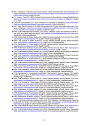 ■ IEP - Institute for Economics and Peace (3.2025): Global Terrorism Index 2025: Measuring The Impact of Terrorism, https://www.economicsandpeace.org/wp-content/uploads/2025/03/Global-Ter rorism-Index-2025.pdf, Zugriff 2.5.2025 ■ KP - Khaama Press (27.4.2023): Pakistan Says Fencing On Durand Line Completed by 98 Percent, https://www.khaama.com/pakistan-says-fencing-on-durand-line-completed-by-98-percent , Zugriff 21.12.2023 ■ Lowy Inst - Lowy Institute (21.9.2023): Pakistan at a crossroads on blasphemy, https://www.lowyin stitute.org/the-interpreter/pakistan-crossroads-blasphemy , Zugriff 12.10.2023 ■ NZZ - Neue Zürcher Zeitung (17.5.2025): Meinungsfreiheit in Indien: Einschränkungen nach Eska lation mit Pakistan, https://www.nzz.ch/international/meinungsfreiheit-in-indien-einschraenkunge n-nach-eskalation-mit-pakistan-ld.1883951 , Zugriff 18.5.2025 ■ PIPS - Pak Institute for Peace Studies (18.5.2025a): Database: report.date between ’2025-04-22’ and ’2025-05-16’AND report.type IN(33), https://pakpips.com/app/database/report.php?srtid=fcnbr, Zugriff 18.5.2025 [kostenpflichtig] ■ PIPS - Pak Institute for Peace Studies (10.4.2025): Pakistan Monthly Security Report: March 2025, https://pakpips.com/app/reports/1734, Zugriff 8.5.2025 [kostenpflichtig] ■ PIPS - Pak Institute for Peace Studies (11.3.2025): Pakistan Monthly Security Report: February 2025, https://pakpips.com/app/reports/1726, Zugriff 8.5.2025 [kostenpflichtig] ■ PIPS - Pak Institute for Peace Studies (10.2.2025): Pakistan Monthly Security Report: January 2025, https://pakpips.com/app/reports/1731, Zugriff 8.5.2025 ■ PIPS - Pak Institute for Peace Studies (30.1.2025a): Pakistan Security Report 2024, https://pakpips. com/app/reports/wp-content/uploads/2025/01/Report_2024.pdf, Zugriff 4.3.2025 ■ PIPS - Pak Institute for Peace Studies (30.1.2025b): Pakistan Monthly Security Report: December 2024, https://pakpips.com/app/reports/1680, Zugriff 8.5.2025 [kostenpflichtig] ■ PIPS - Pak Institute for Peace Studies (5.12.2024): Pakistan Monthly Security Report: November 2024, https://pakpips.com/app/reports/1677, Zugriff 8.5.2025 [kostenpflichtig] ■ PIPS - Pak Institute for Peace Studies (5.11.2024): Pakistan Monthly Security Report: October 2024, https://pakpips.com/app/reports/1673, Zugriff 8.5.2025 ■ PIPS - Pak Institute for Peace Studies (8.10.2024): Pakistan Monthly Security Report: September 2024, https://pakpips.com/app/reports/1647, Zugriff 8.5.2025 [kostenpflichtig] ■ PIPS - Pak Institute for Peace Studies (2.9.2024): Pakistan Monthly Security Report: August 2024, https://pakpips.com/app/reports/1644, Zugriff 11.9.2024 [kostenpflichtig, Login erforderlich] ■ PIPS - Pak Institute for Peace Studies (9.8.2024a): Pakistan Monthly Security Report: July 2024, https://pakpips.com/app/reports/1635, Zugriff 11.9.2024 [kostenpflichtig, Login erforderlich] ■ PIPS - Pak Institute for Peace Studies (9.8.2024b): Tribal Region/KP Security Reports - PIPS Weekly Conflict Report: July 19-25, 2024, https://pakpips.com/app/reports/1629, Zugriff 20.9.2024 [kosten pflichtig, Login erforderlich] ■ PIPS - Pak Institute for Peace Studies (5.7.2024): Pakistan Monthly Security Report: June 2024, https://pakpips.com/app/reports/1617, Zugriff 11.9.2024 [kostenpflichtig, Login erforderlich] ■ PIPS - Pak Institute for Peace Studies (6.6.2024): Pakistan Monthly Security Report - May 2024, https://pakpips.com/app/reports/1602, Zugriff 12.9.2024 [kostenpflichtig, Login erforderlich] ■ PIPS - Pak Institute for Peace Studies (7.5.2024): Pakistan Monthly Security Report: April 2024, https://pakpips.com/app/reports/1586, Zugriff 12.9.2024 [kostenpflichtig, Login erforderlich] ■ PIPS - Pak Institute for Peace Studies (15.4.2024): Pakistan Monthly Security Report - March 2024, https://pakpips.com/app/reports/1574, Zugriff 12.9.2024 [kostenpflichtig, Login erforderlich] ■ PIPS - Pak Institute for Peace Studies (6.3.2024): Pakistan Monthly Security Report: February 2024, https://pakpips.com/app/reports/1552, Zugriff 12.9.2024 [kostenpflichtig, Login erforderlich] ■ PIPS - Pak Institute for Peace Studies (7.2.2024): Pakistan Monthly Security Report: January 2024, https://pakpips.com/app/reports/1532, Zugriff 13.9.2024 [kostenpflichtig, Login erforderlich] ■ PIPS - Pak Institute for Peace Studies (19.1.2024): PIPS Database, Pak-Afghan border-Pak-India border-Pak-Iran border, From 01-01-2023 To 31-12-2023, https://pakpips.com/app/database/report. php?srtid=gipap, Zugriff 19.1.2024 [kostenpflichtig, Login erforderlich] ■ PIPS - Pak Institute for Peace Studies (10.1.2024): Pakistan Security Report 2023, https://pakpips. com/app/reports/wp-content/uploads/2024/01/Security_Report_2023.pdf, Zugriff 11.1.2024 ■ PIPS - Pak Institute for Peace Studies (4.10.2023): Pakistan Monthly Security Report: September 2023, https://pakpips.com/app/reports/1465, Zugriff 11.10.2023 [kostenpflichtig, Login erforderlich] 27