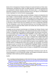 ■ APP - Associated Press of Pakistan (7.2024): Imran Khan, Bushra Bibi acquitted in iddat case, https://www.app.com.pk/national/imran-khan-bushra-bibi-acquitted-in-iddat-case , Zugriff 3.4.2025 ■ Aurat - Aurat Foundation (7.12.2023): More Than Shelter Needs Assessments of Dar Ul Amans & Shelters In Pakistan, https://www.af.org.pk/pub_files/1701949202.pdf, Zugriff 13.2.2025 ■ CBEC - Centre of Biomedical Ethics and Culture of the Sindh Institute of Medical Sciences (12.2023): Honor Killings and Pakistan - Continuing Challenges, In: Bioethics Links - Volume 19 Issue 2 , https:// siut.org/bioethics/pdf/December 2023 Newsletter.pdf, Zugriff 3.5.2024 ■ Cheema M - Cheema, Muhammad Ans Shahzad (11.10.2023): Critiquing the Qisas and Diyat Laws in Pakistan: An Analysis of Legal Ambiguities and Legislative Oversight, https://papers.ssrn.com/so l3/papers.cfm?abstract_id=4598993, Zugriff 3.5.2024 ■ DAWN - DAWN Newspaper (31.12.2024): ‘Honour’ crimes continued to persist in 2024, threatening Pakistani women’s lives, https://www.dawn.com/news/1881836, Zugriff 13.2.2025 ■ DAWN - DAWN Newspaper (4.9.2024): Piety paradox: How iddat became the casualty of a turf war over Pakistan’s family laws, https://www.dawn.com/news/1856394, Zugriff 2.4.2025 ■ DAWN - DAWN Newspaper (5.5.2023): Qisas & diyat laws, https://www.dawn.com/news/1750977, Zugriff 3.5.2024 ■ EB - Encyclopaedia Britannica (19.11.2024a): Pashtun - Definition, People, Culture, Religion, https: //www.britannica.com/topic/Pashtun, Zugriff 25.11.2024 ■ EUAA - European Union Agency for Asylum (17.12.2024): Pakistan - Country Focus, https://euaa.e uropa.eu/sites/default/files/publications/2024-12/2024_12_EUAA_COI_Report_Pakistan_Country _Focus.pdf, Zugriff 7.3.2025 ■ FR24 - France 24 (20.8.2021): Sharia law around the world, https://www.france24.com/en/live-new s/20210820-sharia-law-around-the-world , Zugriff 3.4.2025 ■ GlobalRR - Global Regional Review (9.2024): GRR - Global Regional Review, https://www.grrjou rnal.com/fulltext/examining-the-role-of-womenjirga-in-mitigating-cultural-challenges-faced-by-w omen-a-case-study-of-khwendojirga-in-swat-khyber-pakhtunkhwa-pakistan-since-2013 , Zugriff 3.4.2025 ■ ILS - Islamic Law and Society (6.2021): Sexualization of Shari’a: Application of Islamic Criminal (Hudud) Laws in Pakistan, https://brill.com/view/journals/ils/29/3/article-p319_005.xml , Zugriff 3.4.2025 ■ ITACEC - Idara-e-Taleem-o-Aagahi Centre of Education and Consciousness (o.D.): Manual - Laws for Women Protection in Pakistan, https://itacec.org/creating_spaces/document/Laws_for_Women _Protection_in_Pakistan.pdf, Zugriff 13.2.2025 ■ JPMedA - Journal of the Pakistan Medical Association (17.11.2024): Examining the effects of alcohol prohibition Laws in Pakistan on public health - Vol 74 No.12, https://jpma.org.pk/index.php/public_h tml/article/view/20410/3818, Zugriff 2.4.2025 ■ LSE - London School of Econonomics and Political Science (13.3.2023): No Law but God’s Law: Islam and the Pakistani Legal System, https://blogs.lse.ac.uk/southasia/2023/03/13/no-law-but-god s-law-islam-and-the-pakistani-legal-system , Zugriff 29.3.2025 ■ ÖB Islamabad - Österreichische Botschaft Islamabad [Österreich] (19.12.2023): Asylländerbericht Pakistan ■ PakLagal - Pakistan Legal Awareness Trust (6.3.2024): Den rechtlichen Rahmen für die Zina-Be strafung verstehen, https://pakistanlawyer.com/de/articles/story/understanding-the-legal-framework -for-zina-punishment , Zugriff 29.3.2025 ■ PIDE - Pakistan Institute of Development Economics (5.2024): Reviving the Jirga System as Altern ative Dispute Resolution (ADR) in Pakistan’s Tribal Areas, https://pide.org.pk/research/reviving-the -jirga-system-as-alternative-dispute-resolution-adr-in-pakistans-tribal-areas , Zugriff 28.3.2025 ■ PJCriminology - Pakistan Journal of Criminology (28.9.2023): Jirga and Panchayat for the Resolution of Family Disputes in Pakistan: An Analytical Prospects - Vol 15, No 3, July-September 2023, https://www.pjcriminology.com/wp-content/uploads/2023/09/6.-Jirga-and-Panchayat-for-the-Resol ution.pdf, Zugriff 3.5.2024 ■ RegioTribune - The Regional Tribune (30.12.2023): The Unseen Effects: Assessing Zia’s Socio- Economic Policies in Pakistan, https://submissions.regionaltribune.com/index.php/trt/article/view/1 1/9, Zugriff 29.3.2025 ■ SRishta - Simple Rishta (26.6.2024): Extra Marital Affairs in Pakistan, https://simplerishta.com/extra -marital-affairs-in-pakistan , Zugriff 2.4.2025 70