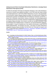 Aufbauprozess der Polizei in den Khyber Pakhtunkhwa Tribal Districts - ehemalige Federal Administered Tribal Agencies (FATA) Im Gebiet der ehemaligen FATA findet ein fortlaufender Übergang zu einer zivilen Rechtsdurch setzung bzw. Exekutive statt (USDOS 23.4.2024). Im Jahr 2018 wurde das Gebiet rechtlich und verwaltungstechnisch in die Provinz Khyber Pakhtunkhwa und somit in das gesamtstaatli che Rechtssystem integriert (Express Tribune 8.12.2024). Die Ausdehnung der Gültigkeit des Rechtssystems garantiert nun theoretisch alle in der Verfassung verankerten Grundrechte, in klusive einer individuellen strafrechtlichen Haftung, Ermittlungen und Strafverfolgung gemäß der Strafprozessordnung und Strafen gemäß dem Strafgesetzbuch (Global ECCO 10.1.2025; vgl. Express Tribune 8.12.2024). Dies erfordert innerhalb der bisherigen polizeilichen Kräfte die Entwicklung neuer Vorgehensweisen, Kompetenzen und Verantwortlichkeiten (Global EC CO 10.1.2025). Im Zuge der Eingliederung in das staatliche Rechtssystem wurden auch die lokalen Sicherheitskräfte - die Khasadars und Levies - in die Polizei von Khyber Pakhtunkhwa eingegliedert (Express Tribune 15.9.2021). Doch die Reform der Polizei geht nur langsam voran (TFT 7.5.2024) [siehe dazu ausführlichRechtsschutz, Justizwesen / Rechtliche und politische Transformation in den KP Tribal Districts (ehemalige FATA)] Quellen ■ AA - Auswärtiges Amt [Deutschland] (14.3.2025): Pakistan: Reise- und Sicherheitshinweise (Teilrei sewarnung), https://www.auswaertiges-amt.de/de/service/laender/pakistan-node/pakistansicherheit /204974, Zugriff 14.3.2025 ■ AA - Auswärtiges Amt [Deutschland] (21.10.2024): Bericht über die asyl- und abschiebungsrelevante Lage in der Islamischen Republik Pakistan, https://www.ecoi.net/en/file/local/2117687/Deutschland. Auswärtiges Amt, Bericht über die asyl- und abschiebungsrelevante Lage in der Islamischen Republik Pakistan, 21.10.2024.pdf, Zugriff 27.12.2024 ■ CIA - Central Intelligence Agency [USA] (12.2.2025): The World Factbook, Pakistan, https://www.ci a.gov/the-world-factbook/countries/pakistan/#military-and-security , Zugriff 15.2.2025 ■ DAWN - DAWN Newspaper (31.1.2023): Death toll from suicide attack on mosque in Peshawar’s Police Lines rises to 100, https://www.dawn.com/news/1734573/death-toll-from-suicide-attack-o n-mosque-in-peshawars-police-lines-rises-to-100 , Zugriff 17.5.2024 ■ Express Tribune - The Express Tribune (8.12.2024): Policing the newly merged districts, https: //tribune.com.pk/story/2514555/policing-the-newly-merged-districts , Zugriff 14.3.2025 ■ Express Tribune - The Express Tribune (7.2.2023): DNA from Peshawar bomber’s head, hair matches with body, https://tribune.com.pk/story/2399710/dna-from-peshawar-bombers-head-hair-matches -with-body, Zugriff 17.5.2024 ■ Express Tribune - The Express Tribune (15.9.2021): Funding for K-P’s merged districts reviewed, https://tribune.com.pk/story/2320266/funding-for-k-ps-merged-districts-reviewed , Zugriff 18.3.2025 ■ FH - Freedom House (5.2024a): Pakistan - Freedom in the World 2024, https://freedomhouse.org/c ountry/pakistan/freedom-world/2024, Zugriff 10.5.2024 ■ Global ECCO - Global Education Community Collaboration Online (10.1.2025): Policing the Tribal Areas of Pakistan: The Influence of Tribal Traditions and the Need for Police Reforms, https://nps. edu/web/ecco/-/zaidi#_edn13, Zugriff 13.3.2025 ■ HRW - Human Rights Watch (16.1.2025): World Report 2025: Rights Trends in Pakistan, https: //www.hrw.org/world-report/2025/country-chapters/pakistan#ce2d83, Zugriff 12.2.2025 ■ PIPS - Pak Institute for Peace Studies (30.1.2025a): Pakistan Security Report 2024, https://pakpips. com/app/reports/wp-content/uploads/2025/01/Report_2024.pdf, Zugriff 4.3.2025 ■ PIPS - Pak Institute for Peace Studies (10.1.2024): Pakistan Security Report 2023, https://pakpips. com/app/reports/wp-content/uploads/2024/01/Security_Report_2023.pdf, Zugriff 11.1.2024 84