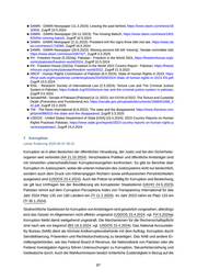 Prüfung von Parteienfinanzierung und Steuerabgaben der Abgeordneten (USDOS 23.4.2024). Außerdem unterliegt die Regierung verschiedenen gesetzlichen Transparenzanforderungen und auch Gesetze über den Zugang zu Informationen gelten in Pakistan bereits seit längerem, doch die Umsetzung in der Praxis ist uneinheitlich. Regierungsstellen ignorieren häufig Anfragen, wobei sich Bürger bei den Informationskommissionen der Provinzen beschweren können. Mit glieder des Parlaments und ausgewählte Amtsträger müssen ihre Einkommen deklarieren und Zivilorganisationen verbreiten diese Deklarationen online (FH 5.2024a). Im August 2022 wurde die Rechenschaftspflicht weiter geschwächt, als eine Änderung der National Accountability Ordinance das NAB darauf beschränkte, nur Korruptionsfälle zu unter suchen, bei denen es um Beträge von 500 Millionen PKR oder mehr ging (BS 19.3.2024). Der Supreme Court wies diese Änderungen allerdings im September 2023 zurück und stellte damit die vorherigen Befugnisse des NAB wieder her (USDOS 23.4.2024). Die Anwendung der gesetzlichen Möglichkeiten ist außerdem häufig selektiv und politisch mo tiviert (FH 5.2024a; vgl. BS 19.3.2024, FH 5.2024a, USDOS 23.4.2024). Während der Regie rungszeit von Imran Khans Pakistan Tehreek-e-Insaf (PTI) zwischen 2018 und 2022 wurden das NAB und die FIA gegen führende Oppositionspolitiker eingesetzt. Seit ihrer Absetzung im April 2022 ist nun umgekehrt die Führung der PTI Gegenstand ähnlicher Kampagnen (BS 19.3.2024; vgl. FH 5.2024a). Währenddessen werden Korruptionsermittlungen nur selten gegen Perso nen geführt, die mit der jeweiligen Bundesregierung verbunden sind. Ebenso stellte das NAB manchmal Ermittlungen oder Strafverfolgungen nach einem Regierungswechsel ein. Dennoch wurden auch einige Verfahren nach einem Regierungswechsel fortgesetzt (USDOS 23.4.2024). Militär und Justiz haben ihre eigenen Systeme zur Bekämpfung von Korruption. Das Militär agiert weitgehend undurchsichtig in seinen Belangen (FH 5.2024a). Quellen ■ AA - Auswärtiges Amt [Deutschland] (21.10.2024): Bericht über die asyl- und abschiebungsrelevante Lage in der Islamischen Republik Pakistan, https://www.ecoi.net/en/file/local/2117687/Deutschland. Auswärtiges Amt, Bericht über die asyl- und abschiebungsrelevante Lage in der Islamischen Republik Pakistan, 21.10.2024.pdf, Zugriff 27.12.2024 ■ BS - Bertelsmann Stiftung (19.3.2024): BTI 2024 Pakistan Country Report, https://bti-project.org/fil eadmin/api/content/en/downloads/reports/country_report_2024_PAK.pdf, Zugriff 19.4.2024 ■ FH - Freedom House (5.2024a): Pakistan - Freedom in the World 2024, https://freedomhouse.org/c ountry/pakistan/freedom-world/2024, Zugriff 10.5.2024 ■ TI - Transparency International (11.2.2025): Corruption Perceptions Index 2024 - Pakistan, https: //www.transparency.org/en/cpi/2024/index/pak, Zugriff 9.3.2025 ■ TI - Transparency International (30.1.2024): 2023 Corruption Perceptions Index - Explore Pakistan’s results, https://www.transparency.org/en/cpi/2023/index/pak, Zugriff 22.5.2024 ■ UKHO - United Kingdom Home Office [United Kingdom] (24.5.2023): Country policy and information note: actors of protection, Pakistan, May 2023, https://www.gov.uk/government/publications/pakista n-country-policy-and-information-notes/country-policy-and-information-note-actors-of-protection-p akistan-may-2023-accessible , Zugriff 2.5.2024 ■ USDOS - United States Department of State [USA] (23.4.2024): 2023 Country Reports on Human Rights Practices Pakistan, https://www.state.gov/reports/2023-country-reports-on-human-rights-p ractices/pakistan/, Zugriff 24.4.2024 88
