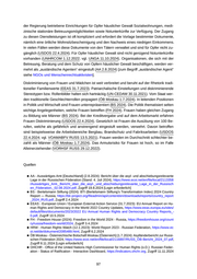 ■ Russland-Analysen/Anonym - Anonym (Autor), Russland-Analysen (Herausgeber) (24.7.2024): Die russische Politik zur Frage häuslicher Gewalt und Beschränkungen der reproduktiven Rechte von Frauen (Russland-Analysen Nr. 453), https://laender-analysen.de/russland-analysen/453/haeuslic he-gewalt-reproduktive-rechte-frauen-russland/ , Zugriff 27.11.2024 ■ StGB RUSS - Strafgesetzbuch [Russland] (9.11.2024): Уголовный кодекс Российской Федерации (N 63-ФЗ) [Strafgesetzbuch der Russischen Föderation], https://www.consultant.ru/document/con s_doc_LAW_10699, Zugriff 18.11.2024 ■ UN-CEDAW - United Nations - Committee on the Elimination of Discrimination against Women (30.11.2021): Convention on the Elimination of All Forms of Discrimination against Women - Con cluding observations on the ninth periodic report of the Russian Federation (CEDAW/C/RUS/CO/9), https://www.ecoi.net/en/file/local/2064360/N2135183.pdf, Zugriff 9.9.2024 ■ UNGA - United Nations General Assembly (11.10.2024): Situation of human rights in the Russian Federation (A/79/508), https://documents.un.org/doc/undoc/gen/n24/291/80/pdf/n2429180.pdf , Zugriff 18.11.2024 ■ UNHRCOM - United Nations Human Rights Committee (1.12.2022): International Covenant on Civil and Political Rights - Concluding observations on the eighth periodic report of the Russian Federation (CCPR/C/RUS/CO/8), https://www.ecoi.net/en/file/local/2083107/G2258965.pdf, Zugriff 16.4.2024 ■ USDOS - United States Department of State [USA] (22.4.2024): 2023 Country Reports on Human Rights Practices: Russia, https://www.state.gov/wp-content/uploads/2024/03/528267_RUSSIA-202 3-HUMAN-RIGHTS-REPORT.pdf , Zugriff 8.5.2024 ■ Verfassung RUSS - Verfassung [Russland] (6.10.2022): Конституция РФ с изменениями 2022 года [Verfassung der RF mit Änderungen des Jahres 2022], http://duma.gov.ru/news/55446, Zugriff 27.2.2024 ■ VOAMABFV RUSS - Verordnung des Arbeitsministeriums: Arbeitsbereiche, die Frauen verwehrt sind [Russland] (13.5.2021): Приказ Минтруда России (N 512н): Об утверждении перечня производств, работ и должностей с вредными и (или) опасными условиями труда, на которых ограничивается применение труда женщин [Verordnung des Arbeitsministeriums Russlands: Über die Bestätigung der Auflistung von Arbeitsbereichen mit schädlichen und (oder) gefährlichen Arbeitsbedingungen, in welchen Frauen nur beschränkt zum Einsatz kommen], https://www.consultant.ru/document/cons_doc_LAW_331608, Zugriff 9.9.2024 ■ VORHSF RUSS - Verordnung der Regierung: Handlungsstrategie für Frauen 2023-2030 [Russland] (29.12.2022): Правительство Российской Федерации - Распоряжение (№ 4356-р): Национальная стратегия действий в интересах женщин на 2023 - 2030 годы [Regierung der Russischen Fö deration - Verordnung: Nationale Handlungsstrategie zur Förderung der Interessen von Frauen für den Zeitraum 2023-2030], http://static.government.ru/media/files/ilHtVCkhskBAE9DAflD3Akpd787 xAOc4.pdf, Zugriff 9.9.2024 18.2 Frauen im Nordkaukasus/Tschetschenien Letzte Änderung 2024-12-16 07:34 Die Lage von Frauen im Nordkaukasus unterscheidet sich von der in anderen Regionen Russ lands (ÖB Moskau 1.7.2024). Nordkaukasische Frauen befinden sich in einer sehr schwierigen sozioökonomischen Situation (CoE-PACE 3.6.2022). Die Lage von Frauen im Nordkaukasus wird durch die Koexistenz dreier Rechtssysteme in der Region – russisches Recht, Gewohn heitsrecht (Adat) und Scharia – zusätzlich erschwert. Gerichtsentscheidungen werden häufig nicht umgesetzt, lokale Behörden richten sich mehr nach der „Tradition“ als nach den russischen Rechtsvorschriften (ÖB Moskau 1.7.2024). Die Menschen im Nordkaukasus leben in einer ge schlossenen, patriarchalischen Gesellschaft. Die lokalen und föderalen Behörden tolerieren Unterdrückung zur Aufrechterhaltung traditioneller Werte. Frauen im Nordkaukasus, welche sich traditionellen Werten nicht unterwerfen wollen, riskieren Folter und Ermordung. Es herrscht Straflosigkeit (CoE-PACE 3.6.2022). Die in Tschetschenien vorherrschende Islam-Interpretation dient als Rechtfertigung für die strikt patriarchalische Machtstruktur (USCIRF 26.10.2021). Das 98