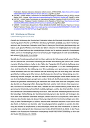 Federation, Mariana Katzarova (Advance edited version; A/HRC/57/59), https://www.ohchr.org/site s/default/files/2024-09/A-HRC-57-59-aev-EN.docx , Zugriff 7.11.2024 ■ USCIRF - United States Commission on International Religious Freedom [USA] (4.2022): Annual Report 2022 - Russia, https://www.ecoi.net/en/file/local/2071908/2022 Russia.pdf, Zugriff 3.9.2024 ■ USCIRF - United States Commission on International Religious Freedom [USA] (26.10.2021): Issue Update Russia - Religious Freedom Violations in the Republic of Chechnya, https://www.uscirf.gov/ sites/default/files/2021-10/2021 Chechnya Issue Update.pdf, Zugriff 1.3.2024 ■ USDOS - United States Department of State [USA] (22.4.2024): 2023 Country Reports on Human Rights Practices: Russia, https://www.state.gov/wp-content/uploads/2024/03/528267_RUSSIA-202 3-HUMAN-RIGHTS-REPORT.pdf , Zugriff 8.5.2024 18.3 Scheidung und Obsorge Letzte Änderung 2024-12-16 16:02 Gemäß der Verfassung der Russischen Föderation haben die Elternteile hinsichtlich der Kinder erziehung gleiche Rechte und Pflichten (Verfassung RUSS 6.10.2022). Laut dem Familienge setzbuch der Russischen Föderation sind Eltern in Bezug auf ihre Kinder gleichberechtigt und haben auch gleiche Pflichten. Die Rechte der Eltern erlöschen mit Volljährigkeit des Kindes (18 Jahre), mit Eheschließung des minderjährigen Kindes und in anderen gesetzlich festgelegten Fällen, wenn ein minderjähriges Kind vor Erreichung der Volljährigkeit die volle Geschäftsfähig keit erlangt (FGB RUSS 23.11.2024). Gemäß dem Familiengesetzbuch darf ein Mann während der Schwangerschaft seiner Ehefrau und im Zeitraum bis zum ersten Geburtstag des Kindes die Auflösung der Ehe nur mit Zustim mung der Ehefrau initiieren. Außer in den Fällen der Paragrafen 21-23 wird die Auflösung einer Ehe von Standesämtern durchgeführt. Gemäß den Paragrafen 21-23 des Familiengesetzbu ches sind Gerichte für die Auflösung einer Ehe zuständig, wenn gemeinsame minderjährige Kinder existieren oder sich die Eheleute über die Auflösung der Ehe nicht einig sind. Bei einer gerichtlichen Auflösung der Ehe können die Eheleute dem Gericht zur Überprüfung eine Ver einbarung darüber vorlegen, bei wem von ihnen die minderjährigen Kinder leben werden und wie die Unterhaltszahlungen geregelt sein werden. Sind sich die Eheleute darüber uneinig oder verletzt die getroffene Vereinbarung die Interessen der Kinder oder eines der Ehegatten, muss das Gericht eine Regelung treffen. Derjenige Elternteil, welcher nicht mit dem Kind zusammen lebt, hat Recht auf Kontakt mit dem Kind, Teilhabe an der Kindererziehung sowie Recht auf gemeinsame Entscheidung hinsichtlich Ausbildungsfragen, welche das Kind betreffen. Kommt ein Elternteil der Gerichtsentscheidung nicht nach, zieht dies eine Verwaltungsstrafe nach sich. Bei böswilliger Nichterfüllung der Gerichtsentscheidung kann das Gericht auf Verlangen des nicht beim Kind lebenden Elternteils verfügen, diesem das Kind zuzusprechen, wenn dies im Interesse des Kindes liegt und dessen Meinung entspricht. Ein Kind ist berechtigt, seine Mei nung zu allen Familienfragen zu äußern, welche seine Interessen berühren. Auch hat ein Kind das Recht, im Rahmen von Gerichts- oder Verwaltungsverfahren angehört zu werden. Die Mei nung des Kindes ist verpflichtend zu berücksichtigen, wenn das Kind mindestens 10 Jahre alt ist, außer dies widerspricht den Interessen des Kindes (FGB RUSS 23.11.2024). In der Praxis bleiben in der Russischen Föderation minderjährige Kinder nach einer Scheidung zu 99 % bei der Mutter (ÖB Moskau 21.2.2023). 101