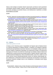 Naloxon. Nicht verfügbar ist Substitol. Morphin, Buprenorphin und Naloxon sind für gewöhnlich ausschließlich stationär erhältlich. Patienten, welchen diese Medikamente ambulant verschrie ben werden, benötigen ein spezielles Rezept, um die Medikamente in Apotheken zu erhalten (EUAA MedCOI 24.8.2020). Quellen ■ AVVRK - Abteilung für Vermögensverhältnisse der Region Krasnodar [Russland] (o.D.): Оформление на принудительное лечение [Formalitäten für eine Zwangsbehandlung], https://diok.ru/opendata/z haloby/oformlenie-na-prinuditelnoe-lechenie.html , Zugriff 19.9.2024 ■ EUAA MedCOI - Medical Country of Origin Information by EUAA (European Agency for Asylum) (9.2022): Russian Federation - Medical Country of Origin Information Report, https://coi.euaa.europ a.eu/administration/easo/PLib/2022_09_EUAA_MedCOI_Country_Report_Russian_Federation.pdf, Zugriff 18.9.2024 ■ EUAA MedCOI - Medical Country of Origin Information by EUAA (European Agency for Asylum) (24.2.2022): International SOS via EUAA MedCOI - AVA 15556 ■ EUAA MedCOI - Medical Country of Origin Information by EUAA (European Agency for Asylum) (24.8.2020): International SOS via EUAA MedCOI - BMA 13939 ■ Nesawisimaja gaseta - Nesawisimaja gaseta (1.10.2021): Зачем России приписывают ВИЧ- катастрофу [Warum Russland die HIV-Katastrophe zugeschrieben wird], https://www.ng.ru/health /2021-10-01/100_161701102021.html, Zugriff 19.9.2024 ■ NMFZPN - Nationales Medizinisches Forschungszentrum für Psychiatrie und Narkologie ’W.P. Serbs kij’ [Russland] (o.D.): Контакты [Kontakt], https://serbsky.ru/kontakty, Zugriff 19.9.2024 ■ NYU - New York University (29.2.2024): How War Worsened the Opioid Crisis in Ukraine, https: //www.nyu.edu/about/news-publications/news/2024/february/war-opioid-crisis-ukraine.html , Zugriff 19.9.2024 ■ Rosstat - Föderales Statistikamt [Russland] (2023a): Здравоохранение в России 2023 - Статистический сборник [Gesundheitswesen in Russland 2023 - Statistischer Sammelband], https://rosstat.gov.ru/s torage/mediabank/Zdravoohran-2023.pdf, Zugriff 19.9.2024 21.3 Diabetes Letzte Änderung 2024-12-10 10:48 In Moskau und St. Petersburg sowie in Hauptstädten der Regionen gibt es Diabetes-Zentren zur modernen Behandlung von Diabetes-Patienten. In ländlichen und entlegenen Gegenden sind Behandlungsmöglichkeiten beschränkt. Bewohner von Großstädten verfügen über einen besseren Zugang zu qualifizierten Spezialisten und medizinischen Geräten. Die medizinische Versorgung von Personen mit endokrinen Erkrankungen wie Diabetes erfolgt im Rahmen der obligatorischen Krankenversicherung prinzipiell kostenlos. Diabetes-Patienten erhalten kosten los zuckersenkende Medikamente, ebenso Desinfektionsmittel, Insulin-Pens, Nadeln usw. Die Kosten mehrerer neuerer Behandlungsmethoden müssen von Patienten selbst getragen wer den. Medikamente zur Behandlung endokriner Erkrankungen sind theoretisch in der gesamten Russischen Föderation verfügbar, jedoch ist die Verfügbarkeit in Großstädten besser (EUAA MedCOI 9.2022). Quelle ■ EUAA MedCOI - Medical Country of Origin Information by EUAA (European Agency for Asylum) (9.2022): Russian Federation - Medical Country of Origin Information Report, https://coi.euaa.europ 135