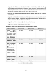 • Bürger, die den Militärdienst nicht absolviert haben – in Verbindung mit der Gewährung eines Militärdienstaufschubs oder in Verbindung mit der Aufhebung der Entscheidung der Einberufungskommission durch eine regionale Einberufungskommission höherer Instanz, nachdem die betreffende Person ein Alter von 30 Jahren erreicht hat; • Bürger, die zum Militärdienst nicht einberufen wurden, nachdem sie ein Alter von 30 Jahren erreicht haben; • Bürger, die den Militärdienst nicht absolviert haben (und dies ohne eine gesetzliche Grund lage), im Einklang mit einer Entscheidung der Einberufungskommission, nachdem die be treffende Person ein Alter von 30 Jahren erreicht hat; • Bürger, die den Wehrersatzdienst (Zivildienst) absolviert haben; • Bürgerinnen, die einen militärrelevanten Beruf haben. Militärische Ränge / Altersgrenzen je nach Reservekategorie (sapas) militärische Ränge Kategorie 1 Kategorie 2 Kategorie 3 Soldat, Matro se, Unteroffizier (serschant), Maat (starschina), Fähn rich (praporscht schik, mitschman) 40 Jahre 50 Jahre 55 Jahre Nachwuchsoffizier (mladschij ofizer) 50 Jahre 55 Jahre 60 Jahre Major, Korvettenka pitän (kapitan 3 ran ga), Oberstleutnant (podpolkownik), Fregattenkapitän (kapitan 2 ranga) 55 Jahre 60 Jahre 65 Jahre Oberst (polkownik), Kapitän zur See (kapitan 1 ranga) 60 Jahre 65 Jahre höherer Offizier 65 Jahre 70 Jahre Quelle 2: FGWW RUSS 2.10.2024 144