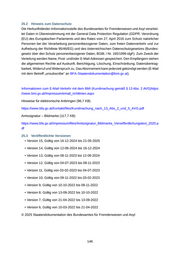 25.2 Hinweis zum Datenschutz Die Herkunftsländer-Informationsstelle des Bundesamtes für Fremdenwesen und Asyl verarbei tet Daten in Übereinstimmung mit der General Data Protection Regulation (GDPR. Verordnung (EU) des Europäischen Parlaments und des Rates vom 27. April 2016 zum Schutz natürlicher Personen bei der Verarbeitung personenbezogener Daten, zum freien Datenverkehr und zur Aufhebung der Richtlinie 95/46/EG) und des österreichischen Datenschutzgesetzes (Bundes gesetz über den Schutz personenbezogener Daten, BGBl. I Nr. 165/1999 idgF). Zum Zweck der Verteilung werden Name, Post- und/oder E-Mail-Adressen gespeichert. Den Empfängern stehen die allgemeinen Rechte auf Auskunft, Berichtigung, Löschung, Einschränkung, Datenübertrag barkeit, Widerruf und Widerspruch zu. Das Abonnement kann jederzeit gekündigt werden (E-Mail mit dem Betreff „ unsubscribe“ an BFA-Staatendokumentation@bmi.gv.at). Informationen zum E-Mail-Verkehr mit dem BMI (Kundmachung gemäß § 13 Abs. 2 AVG)https: //www.bmi.gv.at/Impressum/email_richtlinien.aspx Hinweise für elektronische Anbringen (96,7 KB) https://www.bfa.gv.at/Kontakt/files/Kundmachung_nach_13_Abs_2_und_5_AVG.pdf Amtssignatur – Bildmarke (117,7 KB) https://www.bfa.gv.at/Impressum/files/Amtssignatur_Bildmarke_Veroeffentlichungstext_2020.p df 25.3 Veröffentlichte Versionen • Version 15, Gültig von 16-12-2024 bis 21-05-2025 • Version 14, Gültig von 12-06-2024 bis 16-12-2024 • Version 13, Gültig von 08-11-2023 bis 12-06-2024 • Version 12, Gültig von 04-07-2023 bis 08-11-2023 • Version 11, Gültig von 03-02-2023 bis 04-07-2023 • Version 10, Gültig von 09-11-2022 bis 03-02-2023 • Version 9, Gültig von 10-10-2022 bis 09-11-2022 • Version 8, Gültig von 13-09-2022 bis 10-10-2022 • Version 7, Gültig von 21-04-2022 bis 13-09-2022 • Version 6, Gültig von 10-03-2022 bis 21-04-2022 © 2025 Staatendokumentation des Bundesamtes für Fremdenwesen und Asyl 146