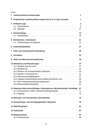 Inhalt 1 Länderspezifische Anmerkungen 1 2 Vergleichende Länderkundliche Analyse (VLA) i.S. § 3 Abs. 4a AsylG 1 3 Politische Lage 2 3.1 Tschetschenien . . . . . . . . . . . . . . . . . . . . . . . . . . . . . . . . . . . . 9 3.2 Dagestan . . . . . . . . . . . . . . . . . . . . . . . . . . . . . . . . . . . . . . . 12 4 Sicherheitslage 13 4.1 Nordkaukasus . . . . . . . . . . . . . . . . . . . . . . . . . . . . . . . . . . . . 18 5 Rechtsschutz / Justizwesen 21 5.1 Tschetschenien und Dagestan . . . . . . . . . . . . . . . . . . . . . . . . . . . 24 6 Sicherheitsbehörden 27 7 Folter und unmenschliche Behandlung 30 8 Korruption 31 9 NGOs und Menschenrechtsaktivisten 34 10 Wehrdienst und Rekrutierungen 37 10.1 Überblick über die Armee . . . . . . . . . . . . . . . . . . . . . . . . . . . . . . 37 10.2 Mobilisierung . . . . . . . . . . . . . . . . . . . . . . . . . . . . . . . . . . . . . 44 10.3 Situation von Grundwehrdienern (Rekruten) . . . . . . . . . . . . . . . . . . . . 49 10.4 Situation in Tschetschenien . . . . . . . . . . . . . . . . . . . . . . . . . . . . . 52 10.5 Rekrutierung Strafgefangener . . . . . . . . . . . . . . . . . . . . . . . . . . . . 57 10.6 Irreguläre Kampfverbände (private Militärunternehmen usw.) . . . . . . . . . . 58 10.7 Wehr-/Kriegsdienstverweigerung/Desertion . . . . . . . . . . . . . . . . . . . . 59 10.8 Wehrersatzdienst/Zivildienst . . . . . . . . . . . . . . . . . . . . . . . . . . . . . 64 11 Allgemeine Menschenrechtslage, Ombudsperson, Menschenhandel, Flüchtlinge 67 11.1 Tschetschenien, Kritiker, Tschetschenienkrieg-Kämpfer . . . . . . . . . . . . . 71 11.2 Dagestan . . . . . . . . . . . . . . . . . . . . . . . . . . . . . . . . . . . . . . . 75 12 Meinungs- und Pressefreiheit, Internetfreiheit 75 13 Versammlungs- und Vereinigungsfreiheit, Opposition 78 14 Haftbedingungen 81 15 Todesstrafe 84 16 Religionsfreiheit 84 16.1 Tschetschenien . . . . . . . . . . . . . . . . . . . . . . . . . . . . . . . . . . . . 88 IV