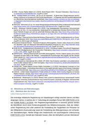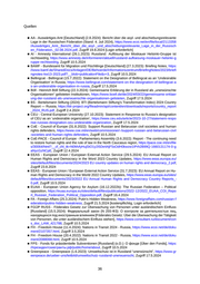 Quellen ■ AA - Auswärtiges Amt [Deutschland] (2.8.2024): Bericht über die asyl- und abschiebungsrelevante Lage in der Russischen Föderation (Stand: 4. Juli 2024), https://www.ecoi.net/en/file/local/2113358 /Auswärtiges_Amt,_Bericht_über_die_asyl-_und_abschiebungsrelevante_Lage_in_der_Russisch en_Föderation,_02.08.2024.pdf, Zugriff 19.8.2024 [Login erforderlich] ■ AI - Amnesty International (26.1.2023): Russland: Auflösung der Moskauer Helsinki-Gruppe ist rechtswidrig, https://www.amnesty.de/informieren/aktuell/russland-aufloesung-moskauer-helsinki-g ruppe-rechtswidrig, Zugriff 10.5.2024 ■ BAMF - Bundesamt für Migration und Flüchtlinge [Deutschland] (27.3.2023): Briefing Notes, https: //www.bamf.de/SharedDocs/Anlagen/DE/Behoerde/Informationszentrum/BriefingNotes/2023/briefi ngnotes-kw13-2023.pdf?__blob=publicationFile&v=3, Zugriff 10.5.2024 ■ Bellingcat - Bellingcat (15.7.2022): Statement on the Designation of Bellingcat as an ’Undesirable Organisation’ in Russia, https://www.bellingcat.com/statement-on-the-designation-of-bellingcat-a s-an-undesirable-organisation-in-russia , Zugriff 17.5.2024 ■ Böll - Heinrich Böll Stiftung (22.3.2024): Gemeinsame Erklärung der in Russland als „ unerwünschte Organisationen“ gelisteten Institutionen, https://www.boell.de/de/2024/03/22/gemeinsame-erklaer ung-der-russland-als-unerwuenschte-organisationen-gelisteten , Zugriff 17.5.2024 ■ BS - Bertelsmann Stiftung (2024): BTI (Bertelsmann Stiftung’s Transformation Index) 2024 Country Report — Russia, https://bti-project.org/fileadmin/api/content/en/downloads/reports/country_report _2024_RUS.pdf, Zugriff 2.4.2024 ■ CEU - Central European University (27.10.2023): Statement in Response to Russia’s designation of CEU as an ’undesirable organization’, https://www.ceu.edu/article/2023-10-27/statement-respo nse-russias-designation-ceu-undesirable-organization , Zugriff 17.5.2024 ■ CoE - Council of Europe (31.8.2022): Support Russian and Belarusian civil societies and human rights defenders, https://www.coe.int/en/web/commissioner/-/support-russian-and-belarusian-civil -societies-and-human-rights-defenders , Zugriff 10.5.2024 ■ CoE-PACE - Council of Europe - Parliamentary Assembly (3.6.2022): Report - The continuing need to restore human rights and the rule of law in the North Caucasus region, https://pace.coe.int/en/file s/30064/html?__cf_chl_tk=N0MvfyHujStO1y2i5De4AjF5sOdH0kwzw1IPrh2B99Q-1660131174-0-g aNycGzNCpE, Zugriff 12.4.2024 ■ EEAS - European Union / European External Action Service (29.5.2024): EU Annual Report on Human Rights and Democracy in the Word 2023 Country Updates, https://www.eeas.europa.eu/ sites/default/files/documents/2024/2023 EU country updates on human rights and democracy_2.pdf, Zugriff 23.8.2024 ■ EEAS - European Union / European External Action Service (31.7.2023): EU Annual Report on Hu man Rights and Democracy in the World 2022 Country Updates, https://www.eeas.europa.eu/sites/ default/files/documents/2023/2022 EU Annual Human Rights and Democracy Country Reports_- 0.pdf, Zugriff 10.5.2024 ■ EUAA - European Union Agency for Asylum (16.12.2022b): The Russian Federation – Political opposition, https://euaa.europa.eu/sites/default/files/publications/2022-12/2022_EUAA_COI_Repo rt_Russian_Federation_Political_Opposition.pdf, Zugriff 16.4.2024 ■ FA - Foreign Affairs (25.3.2024): Putin’s Hidden Weakness, https://www.foreignaffairs.com/russian-f ederation/putins-hidden-weakness, Zugriff 21.5.2024 [kostenpflichtig, Login erforderlich] ■ FGÜP RUSS - Föderales Gesetz zur Überwachung von Personen unter ausländischem Einfluss [Russland] (15.5.2024): Федеральный закон (N 255-ФЗ): О контроле за деятельностью лиц, находящихся под иностранным влиянием [Föderales Gesetz: Über die Überwachung der Tätigkeit von Personen, die unter ausländischem Einfluss stehen], https://www.consultant.ru/document/con s_doc_LAW_421788, Zugriff 10.5.2024 ■ FH - Freedom House (11.4.2024): Nations in Transit 2024 - Russia, https://www.ecoi.net/de/doku ment/2107357.html, Zugriff 3.5.2024 ■ FH - Freedom House (20.4.2022): Nations in Transit 2022 - Russia, https://www.ecoi.net/de/doku ment/2088068.html, Zugriff 10.5.2024 ■ FPS - Fonds für präsidentielle Subventionen [Russland] (o.D.): О фонде [Über den Fonds], https: //президентскиегранты.рф/public/home/about, Zugriff 10.5.2024 ■ Greenpeace - Greenpeace (1.6.2023): Umweltschutz ist in Russland “unerwünscht”, https://www.gr eenpeace.de/ueber-uns/leitbild/umweltschutz-russland-unerwuenscht , Zugriff 17.5.2024 36