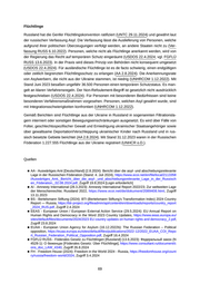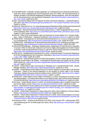 ■ FVGOPMR RUSS - Föderales Verfassungsgesetz zur Ombudsperson für Menschenrechte [Russ land] (29.5.2023): Федеральный конституционный закон (N 1-ФКЗ): Об Уполномоченном по правам человека в Российской Федерации [Föderales Verfassungsgesetz: Über die Ombudsper son für Menschenrechte in der Russischen Föderation], https://www.consultant.ru/document/cons_ doc_LAW_13440, Zugriff 26.8.2024 ■ IOM - International Organization for Migration (8.2024): Russische Föderation - Länderinformations blatt 2024, https://files.returningfromgermany.de/files/CFS_ The Russian Federation 2024_DE.pdf, Zugriff 12.11.2024 ■ Memorial - Memorial (o.D.a): Что такое Международный Мемориал [Was ist Memorial International?], https://www.memo.ru/ru-ru/memorial/memorial-international-aims , Zugriff 10.5.2024 ■ ÖB Moskau - Österreichische Botschaft Moskau [Österreich] (1.7.2024): Asylländerbericht zur Russi schen Föderation 2024, https://www.ecoi.net/en/file/local/2116897/RUSS_ÖB-Bericht_2024_07.pdf, Zugriff 8.11.2024 [Login erforderlich] ■ OHCHR - Office of the United Nations High Commissioner for Human Rights (o.D.): Russian Feder ation - Status of Ratification - Interactive Dashboard, https://indicators.ohchr.org, Zugriff 11.11.2024 ■ OPMR RUSS - Ombudsperson für Menschenrechte [Russland] (o.D.a): Статус и полномочия [Sta tus und Befugnisse], https://ombudsmanrf.org/ombudsman/status_auth, Zugriff 26.8.2024 ■ OPMR RUSS - Ombudsperson für Menschenrechte [Russland] (o.D.b): Ежегодные доклады [Jähr liche Berichte], https://ombudsmanrf.org/documents/ezhegodnye-doklady, Zugriff 26.8.2024 ■ OSCE/ODIHR/Nußberger - Nußberger, Angelika (Autor), Organization for Security and Co-operation in Europe / Office for Democratic Institutions and Human Rights (Herausgeber) (22.9.2022): Report on Russia’s Legal and Administrative Practice in Light of its OSCE Human Dimension Commitments, https://www.osce.org/files/f/documents/7/5/526720.pdf, Zugriff 26.8.2024 ■ StGB RUSS - Strafgesetzbuch [Russland] (9.11.2024): Уголовный кодекс Российской Федерации (N 63-ФЗ) [Strafgesetzbuch der Russischen Föderation], https://www.consultant.ru/document/con s_doc_LAW_10699, Zugriff 18.11.2024 ■ SWP/Fischer - Stiftung Wissenschaft und Politik (Herausgeber), Fischer, Sabine (Autor) (19.4.2022): Russland auf dem Weg in die Diktatur - Innenpolitische Auswirkungen des Angriffs auf die Ukraine (SWP-Aktuell 31), https://www.swp-berlin.org/publications/products/aktuell/2022A31_Russland_Dik tatur.pdf, Zugriff 2.4.2024 ■ UNHCR - United Nations High Commissioner for Refugees (o.D.): Operational Data Portal - Ukraine Refugee Situation, https://data.unhcr.org/en/situations/ukraine, Zugriff 29.11.2024 ■ UNHRC - United Nations Human Rights Council (13.9.2024): Situation of human rights in the Russian Federation - Report of the Special Rapporteur on the situation of human rights in the Russian Federation, Mariana Katzarova (Advance edited version; A/HRC/57/59), https://www.ohchr.org/site s/default/files/2024-09/A-HRC-57-59-aev-EN.docx , Zugriff 7.11.2024 ■ UNHRCOM - United Nations Human Rights Committee (1.12.2022): International Covenant on Civil and Political Rights - Concluding observations on the eighth periodic report of the Russian Federation (CCPR/C/RUS/CO/8), https://www.ecoi.net/en/file/local/2083107/G2258965.pdf, Zugriff 16.4.2024 ■ UN News - United Nations News (7.4.2022): UN General Assembly votes to suspend Russia from the Human Rights Council, https://news.un.org/en/story/2022/04/1115782, Zugriff 29.11.2024 ■ UNTC - United Nations Treaty Collection (29.11.2024): Convention relating to the Status of Refugees, https://treaties.un.org/Pages/ViewDetailsII.aspx?src=TREATY&mtdsg_no=V-2&chapter=5&Temp= mtdsg2&clang=_en, Zugriff 29.11.2024 ■ USDOS - United States Department of State [USA] (24.6.2024): 2024 Trafficking in Persons Report: Russia, https://www.ecoi.net/de/dokument/2111585.html, Zugriff 26.8.2024 ■ USDOS - United States Department of State [USA] (22.4.2024): 2023 Country Reports on Human Rights Practices: Russia, https://www.state.gov/wp-content/uploads/2024/03/528267_RUSSIA-202 3-HUMAN-RIGHTS-REPORT.pdf , Zugriff 8.5.2024 ■ Verfassung RUSS - Verfassung [Russland] (6.10.2022): Конституция РФ с изменениями 2022 года [Verfassung der RF mit Änderungen des Jahres 2022], http://duma.gov.ru/news/55446, Zugriff 27.2.2024 70