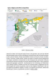 Quelle 3: FR24 26.12.2024a Obwohl die Zahlen nicht überprüft werden können, wird geschätzt, dass weit über 500.000 Menschen getötet wurden und über zwölf Millionen innerhalb Syriens oder ins Ausland vertrieben wurden, darunter Alawiten, Christen (einschließlich Armenier und Assyrer), Drusen, Ismailiten, Kurden, Turkmenen, Zwölfer-Schiiten, Jesiden und andere. Al-Assads zynische Mobilisierung von Ängsten innerhalb der Gemeinschaft vor dem Hintergrund des wachsenden Einflusses extremistischer Elemente innerhalb der syrischen Oppositionskräfte führte zu einer zunehmend konfessionell geprägten Landschaft – beschleunigt durch die Vertreibung von Minderheiten durch militante Gruppen in Gebieten, die unter ihrer Kontrolle standen. Infolgedessen hat sich die Demografie des Landes neu geordnet, wobei sich die religiösen Minderheiten in den von der Regierung kontrollierten Gebieten in Zentral- und Südsyrien konzentrieren, während die Bevölkerung im Norden nun größtenteils sunnitisch ist (MRG 1.2025). 195