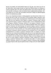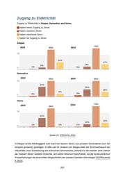 Schulen und privaten Haushalten massiv betrifft (ÖB Damaskus 2023). Millionen Syrer, können sich die hohen Gebühren für private Stromgeneratoren oder die Installation von Solarzellen nicht leisten (Independent 28.3.2025). In den wohlhabendsten Gegenden von Damaskus, wie Mezzeh und al-Maliki gibt es vier Stunden Strom am Tag. Je weiter man sich von der Stadt entfernt, desto weniger Strom gibt es. Manche Gebiete haben seit Jahren keinen Strom mehr (UNRCHCSYR 22.9.2024). Bei einer von der Staatendokumentation in Auftrag gegebenen so zio-ökonomische Studie durch computergestützte Telefoninterviews, bei der 600 Syrer im Alter von 16-35 Jahren in den drei größten Städten, Damaskus, Homs und Aleppo im Juli 2024 befragt wurden, bestätigt sich dieses Bild. 2 % der Befragten gaben an, immer Elektrizität zur Verfügung zu haben, gefolgt von denjenigen, die meistens Elektrizität zur Verfügung hatten (14 %). Der größte Anteil der Befragten hatte manchmal Elektrizität zur Verfügung (68 %). Ein Anteil von 16 % hatte nie Elektrizität zur Verfügung. Ein Vergleich der Geschlechter zeigte, dass 2 % der männlichen und 1 % der weiblichen Befragten immer Zugang zu Elektrizität hatten, während 14 % der männlichen und 16 % der weiblichen Teilnehmer meistens Zugang zu Elektrizität hatten. 67 % der männlichen und 69 % der weiblichen Befragten hatten manchmal Zugang zu Elektrizität, während 17 % der männlichen Umfrageteilnehmer nie Zugang zu Elektrizität hatten. Dies gilt für 14 % der weiblichen Teilnehmer. Im Vergleich zum Vorjahr hatte sich die Verfügbar keit von Elektrizität in den Wohnhäusern der Befragten verschlechtert (STDOK/SL 2024). Nur 1 % der im Zuge einer telefonischen Umfrage im August und September 2023 Befragten gaben an, immer Elektrizität zur Verfügung zu haben, gefolgt von denjenigen, die meistens Elektrizität zur Verfügung hatten (25 %). Den größten Anteil der Befragten bilden diejenigen, die manchmal Elektrizität zur Verfügung hatten (63 %). 11 % hatten nie Elektrizität zur Verfügung (STDOK/SL 14.2.2024). Die folgende von der Staatendokumentation erstellte Grafik zeigt die Ergebnisse dieser Studien im Städtevergleich: 256