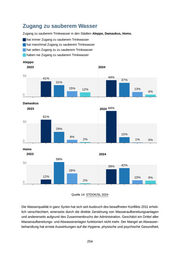 Mezzeh und al-Maliki, eine Stunde fließend Wasser pro Tag gibt. Umso weiter man sich von der Stadt entfernt, desto weniger Stunden am Tag hat man fließend Wasser zur Verfügung. In manchen Gegenden gibt es seit Jahren kein fließend Wasser mehr. Manche Gegenden, nicht weit außerhalb von Damaskus, haben kein fließend Wasser (UNRCHCSYR 22.9.2024). UNO CHA meldete am 16.12.2024, dass zwei Millionen Menschen in Aleppo von Wasserknappheit bedroht sind (UNOCHA 16.12.2024). Eine von der Staatendokumentation in Auftrag gegebene sozio-ökonomische Studie, im Zu ge derer 600 Syrer im Alter von 16-35 Jahren in den drei größten Städten, Damaskus, Homs und Aleppo im Juli 2024 mittels computergestützter Telefoninterviews (CATI) befragt wurden, zeigt, dass 56 % der Teilnehmer immer Zugang zu sauberem Trinkwasser hatten, während 31 % manchmal Zugang zu sauberem Trinkwasser hatten. 8 % der Umfrageteilnehmer hatten selten Zugang zu sauberem Trinkwasser, während 5 % nie Zugang zu sauberem Trinkwas ser hatten. 55 % der männlichen und 56 % der weiblichen Befragten hatten immer Zugang zu sauberem Trinkwasser. Der Anteil derjenigen, die manchmal Zugang zu sauberem Trinkwasser hatten, ist bei den weiblichen Umfrageteilnehmern (33 %) etwas höher als bei den männlichen Teilnehmern (31 %). 8 % der männlichen und 7 % der weiblichen Befragten hatten selten Zugang zu sauberem Trinkwasser, während mindestens 6 % der männlichen und 4 % der weiblichen Umfrageteilnehmer nie Zugang zu sauberem Trinkwasser hatten. Im Vergleich zum Vorjahr bedeutet das eine Verbesserung (STDOK/SL 2024). Bei einer von der Staatendokumentation in Auftrag gegebenen Studie, bei der im August und September 2023 Personen im Alter von 16-35 Jahren in den drei größten Städten, Damaskus, Aleppo und Homs befragt wurden, ga ben 38 % an immer Zugang zu sauberem Trinkwasser zu haben, während 40 % manchmal Zugang zu sauberem Trinkwasser hatten. Im Gegensatz dazu hatten 17 % selten Zugang zu sauberem Trinkwasser, während 5 % nie Zugang zu sauberem Trinkwasser hatten (STDOK/SL 14.2.2024).Folgende Grafik zeigt die Ergebnisse dieser Umfrage auf die drei Städte aufgeteilt: 253