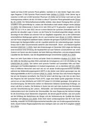 Wirtschaftliche Lage Die Herausforderungen sind enorm. Syriens Wirtschaft hatte 2011 einen Wert von 67,5 Milliar den US-Dollar (63,9 Milliarden Euro). Das Land lag in der globalen BIP-Rangliste auf Platz 68 von 196 Ländern, vergleichbar mit Paraguay und Slowenien. Im Jahr 2023 war die Wirtschaft auf Platz 129 der Rangliste gefallen, nachdem sie nach Schätzungen der Weltbank um 85 % auf nur neun Milliarden US-Dollar geschrumpft war. Damit lag das Land auf einer Stufe mit Ländern wie dem Tschad und den palästinensischen Autonomiegebieten. Der Konflikt hat die Infrastruktur des Landes verwüstet und das Strom-, Transport- und Gesundheitssystem nachhaltig geschä digt. Mehrere Städte, darunter Aleppo, ar-Raqqa und Homs, wurden weitgehend zerstört (DW 10.12.2024). Die Sanktionen hatten die stärksten Auswirkungen auf die wirtschaftliche Lage, besonders auf den Energiesektor (GovHoms 17.9.2024). Die Vereinigten Staaten und westliche Länder haben eine Reihe von Sanktionen gegen al-Assad persönlich, Mitglieder seiner Familie, hochrangige Persönlichkeiten des Regimes sowie mit ihm verbundene Unternehmen verhängt. Zu den bekanntesten gehörten: der Ceasar-Act und die Captagon-Acts 1 und 2. Nachdem im Jahr 2014 ein ehemaliger Militärfotograf der syrischen Militärpolizei unter dem Pseudonym „ Cae sar“ Fotos von Leichen von Menschen, die in Haftanstalten in Syrien gefoltert worden waren, veröffentlich hatte, und ein internationales Untersuchungsteam die Echtheit der Bilder bestätigte, wurde der Caesar-Act 2020 von den USA erlassen. Dieser verhängte Wirtschaftssanktionen gegen Syrien. Die Sanktionen des Caesar-Gesetzes zielten auf diejenigen ab, die dem As sad-Regime den Erwerb von Gütern, Dienstleistungen oder Technologien erleichtern, die die militärischen Aktivitäten des Regimes und seine Industrien in den Bereichen Luftfahrt, Öl- und Gasförderung sowie Bau und Technik unterstützen. Das Gesetz stellt Bedingungen für die Auf hebung der Sanktionen, darunter die Einstellung der syrischen (und russischen) Luftangriffe auf Zivilisten, die Aufhebung der Beschränkungen für die Verteilung humanitärer Hilfe in den vom Regime kontrollierten Gebieten, die Freilassung aller politischen Gefangenen, die Einhaltung internationaler Verträge über Massenvernichtungswaffen, die Erleichterung der Rückkehr von Flüchtlingen und die Einleitung eines Prozesses echter Rechenschaftspflicht und nationaler Aussöhnung im Einklang mit der Resolution 2254 des UN-Sicherheitsrates. Der Captagon-Act 2 zielt auf alle Personen gleich welcher Nationalität ab, die an der Herstellung oder dem Schmug gel von Drogen beteiligt sind oder von den Erträgen aus dem Drogenhandel profitieren (AlHurra 15.12.2024a). Die beiden wichtigsten Säulen der syrischen Wirtschaft – Öl und Landwirtschaft – wurden durch den Krieg stark in Mitleidenschaft gezogen.Syriens Ölexporte machten im Jahr 2010 etwa ein Viertel der Staatseinnahmen aus. Die Lebensmittelproduktion trug einen ähnlichen Betrag zum BIP bei. Das Assad-Regime verlor die Kontrolle über die meisten seiner Ölfelder an Rebel lengruppen, darunter der selbst ernannte Islamische Staat (IS) und später kurdisch geführte Truppen. Internationale Sanktionen schränkten die Fähigkeit der Regierung, Öl zu exportieren, stark ein. Da die Ölförderung in den vom Regime kontrollierten Gebieten im vergangenen Jahr auf weniger als 9.000 Barrel pro Tag zurückging, war das Land stark auf Importe aus dem Iran angewiesen (DW 10.12.2024). 258