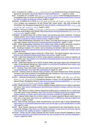 ■ AJ - Al Jazeera (12.1.2025): شيجلﺍ ينﺩﺭألﺍ طبحي ةلواحم بيرهت نم ايﺭوس [Jordanische Armee vereitelt Schmug gelversuch aus Syrien], https://www.aljazeera.net/news/2025/1/12/----- , Zugriff 13.1.2025 ■ AJ - Al Jazeera (31.12.2024b): ايكرت دكؤت اهﺩﺍدعتسﺍ ديوزتل ايﺭوس نانبلو ةقاطلاب [Türkei bestätigt Bereitschaft zu Energielieferungen an Syrien und Libanon], https://www.aljazeera.net/ebusiness/2024/12/31/turki ye-confirms-supply-syria-lebanon-energy , Zugriff 3.1.2025 ■ Akhbar - Al Akhbar (31.12.2024): عئاقو نم ﺕﺍﺭﺍوح عم ﺓﺩاق ايﺭوس :ﺓديدجلﺍ فيك رظني ﻉرشلﺍ ىلﺇ ليصافت ﺓﺭﺍﺩﺇ ةلحرملﺍ ؟ةيلاقتنالﺍ [Fakten aus Gesprächen mit den Führern des „ neuen Syrien“: Wie sieht al-Sharaa die Einzelheiten des Übergangsmanagements?], https://al-akhbar.com/lebanon/817920/-ﺕﺍﺭﺍوح-نم-عئاقو ىلﺇ-ﻉرشلﺍ-رظني-فيك—ﺓديدجلﺍ-ايﺭوس–ﺓﺩاق-عم Zugriff 3.1.2025 ■ AlHurra - Al-Hurra (2.1.2025): ﺓرئاط ﺕﺍدعاسم ةيئاغﺇ ةثلاث نم ةيﺩوعسلﺍ ىلﺇ ايﺭوس [Drittes Nahrungsmittelhilfsflug zeug aus Saudi-Arabien nach Syrien], https://www.alhurra.com/syria/2025/01/02/-ةيئاغﺇ-ﺕﺍدعاسم-ﺓرئاط ايﺭوس-ةيﺩوعسلﺍ-ةثلاث Zugriff 2.1.2025 ■ Arabiya - Al Arabiya News (29.12.2024): Syria’s new elections and draft constitution: Al-Sharaa outlines timeline, https://english.alarabiya.net/News/middle-east/2024/12/29/syria-s-new-elections -and-draft-constitution-al-sharaa-outlines-timeline , Zugriff 3.1.2025 ■ BBC - British Broadcasting Corporation (20.12.2024): US scraps $10m bounty for arrest of Syria’s new leader Sharaa, https://www.bbc.com/news/articles/c07gv3j818ko, Zugriff 7.1.2025 ■ BBC - British Broadcasting Corporation (10.12.2024): Syria: Which countries have been involved in the war and why?, https://www.bbc.com/news/articles/cd75e8gdy9jo, Zugriff 11.12.2024 ■ BI - Brookings Institution (27.1.2023): Syria’s dissolving line between state and nonstate actors, https://www.brookings.edu/articles/syrias-dissolving-line-between-state-and-nonstate-actors/ , Zugriff 25.9.2023 ■ CIA - Central Intelligence Agency [USA] (31.7.2024): Syria - The World Factbook, https://www.cia. gov/the-world-factbook/countries/syria/#military-and-security , Zugriff 2.8.2024 ■ CNN - Cable News Network (30.12.2024): Syrian elections could take up to 4 years to organize, de facto leader says, https://edition.cnn.com/2024/12/30/middleeast/syria-elections-four-years-intl/in dex.html, Zugriff 3.1.2025 ■ CNN - Cable News Network (16.12.2024): Russian military has begun large-scale withdrawal from Syria, US and Western officials say, https://edition.cnn.com/2024/12/16/politics/russia-military-syria -withdrawal/index.html, Zugriff 7.1.2025 ■ FT - Financial Times (29.1.2025): Syrias new rulers press Russia for reparations, https://www.ft.c om/content/0fe18a07-2e10-456f-98f2-2d3624b83c75 , Zugriff 29.1.2025 ■ GCSP - Geneva Centre for Security Policy (10.2020): The Syrian National Army (SNA): Structure, Functions, and Three Scenarios for its Relationship with Damascus, https://dam.gcsp.ch/files/doc/ sna-structure-function-damascus , Zugriff 20.9.2023 ■ LBCI - Lebanese Broadcasting Corporation International (8.1.2025): ةلوؤسم ةيﺩرك :ةيﺭوس ناكمإب ﺕﺍوقلﺍ ةيكريمألﺍ ةيسنرفلﺍو نيمأت ﺩودح ايﺭوس ةيلامشلﺍ [Kurdischer Beamter in Syrien: US und französische Streitkräfte können Syriens Nordgrenze sichern], https://www.lbcgroup.tv/news/world/829301/-ةيﺭوس-ةيﺩرك-ةلوؤسم ايﺭوس-ﺩودح-نيمأت-ةيسنرفلﺍو-ةيكريمألﺍ-ﺕﺍوقلﺍ-ناكمإب ar, Zugriff 9.1.2025 ■ MEE - Middle East Eye (2.1.2025): Turkey to establish strategic defence ties and military cooperation with Syria, https://www.middleeasteye.net/news/turkey-establish-strategic-defense-ties-syria , Zugriff 3.1.2025 ■ NBC - NBC News (5.2.2025): Defense Department drafting plans to withdraw all U.S. troops from Syria after recent Trump comments, https://www.nbcnews.com/politics/national-security/dod-draftin g-plans-withdraw-us-troops-syria-recent-trump-comments-rcna190726 , Zugriff 26.2.2025 ■ NPR - National Public Radio (31.12.2024): Syria’s U.S.-trained opposition fighters wait to learn of their role in a new Syria, https://www.npr.org/2024/12/31/g-s1-39955/syria-opposition-fighters-hts -military-us, Zugriff 3.1.2025 ■ NZZ - Neue Zürcher Zeitung (8.1.2025): Desinformation: Iran will die Lage in Syrien destabilisieren, https://www.nzz.ch/international/desinformation-iran-will-die-lage-in-syrien-destabilisieren-ld.1865 238, Zugriff 9.1.2025 ■ NZZ - Neue Zürcher Zeitung (8.12.2024): Syrien: Zusammenbruch des Asad-Regimes und Vor marsch der Rebellen, https://www.nzz.ch/international/syrien-zusammenbruch-des-asad-regimes -und-vormarsch-der-rebellen-ld.1861417 , Zugriff 10.12.2024 ■ Presse - Presse, Die (28.1.2025): Erstmals seit Sturz Assads ist eine russische Delegation in Syrien, https://www.diepresse.com/19302373/erstmals-seit-sturz-assads-ist-eine-russische-delegation-i n-syrien, Zugriff 29.1.2025 43