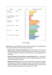 Quelle 1: WB 2024 Erklärung: Der WGI der Weltbank misst sechs umfassende Dimensionen der Regierungsfüh rung - je länger die Balken bzw. höher der Wert, desto positiver: • Mitspracherecht und Rechenschaftspflicht (Voice and Accountability - VA) - erfasst die Wahrnehmung des Ausmaßes, in dem die Bürger eines Landes in der Lage sind, sich an der Wahl ihrer Regierung zu beteiligen, sowie die Meinungs- und Vereinigungsfreiheit und freie Medien. • Politische Stabilität und Abwesenheit von Gewalt/Terrorismus (PV) - Erfassung der Wahrnehmung der Wahrscheinlichkeit von politischer Instabilität und/oder politisch motivier ter Gewalt, einschließlich Terrorismus. • Effektivität der Regierung (GE) - Erfassung der Wahrnehmung der Qualität der öffentlichen Dienstleistungen, der Qualität des öffentlichen Dienstes und des Grades seiner Unabhän gigkeit von politischem Druck, der Qualität der Politikformulierung und -umsetzung sowie der Glaubwürdigkeit des Engagements der Regierung für diese Politik. 8