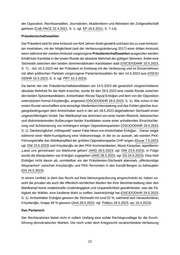 Europäische Parlament zeigte sich in seiner Entschließung vom 19.5.2021 „ beunruhigt darüber, dass sich die autoritäre Auslegung des Präsidialsystems konsolidiert“, und „ dass sich die Macht nach der Änderung der Verfassung nach wie vor in hohem Maße im Präsidentenamt konzentriert, nicht nur zum Nachteil des Parlaments, sondern auch des Ministerrats selbst, weshalb keine solide und effektive Gewaltenteilung zwischen der Exekutive, der Legislative und der Judikative gewährleistet ist“ (EP 19.5.2021, S. 20/Pt. 55). In einer weiteren Entschließung vom September 2023 erklärte sich das Europäische Parlament „ tief besorgt über die fortwährende übermäßige Machtkonzentration beim türkischen Präsidenten ohne wirksames System von Kontrollen und Gegenkontrollen, durch die die demokratischen Institutionen des Landes erheblich geschwächt wurden; [und] betont, dass die fehlende Eigenständigkeit auf mehreren Verwaltungsebenen aufgrund der extremen Abhängigkeit vom Präsidenten bei allen Arten von Entscheidungen und der Alleinherrschaft eines einzigen Mannes ein dysfunktionales System zur Folge haben kann“ (EP 13.9.2023, Pt. 20; vgl. EP 19.5.2021, Pt. 55). Machtfülle des Staatspräsidenten Die exekutive Gewalt ist beim Präsidenten konzentriert. Dieser verfügt überdies über umfang reiche legislative Kompetenzen und weitgehenden Zugriff auf die Justizbehörden (ÖB Ankara 28.12.2023, S.7; vgl. EC 30.10.2024, S. 19f.).Die gesetzgebende Funktion des Parlaments wird durch die häufige Anwendung von Präsidialdekreten und Präsidialentscheidungen einge schränkt. So hat auch die politische Opposition nur sehr begrenzte Möglichkeiten die Tages ordnung der Parlamentsdebatten zu beeinflussen. Das Fehlen einer wirksamen gegenseitigen Kontrolle und die Unfähigkeit des Parlaments, das Amt des Präsidenten wirksam zu überwa chen, führen dazu, dass dessen politische Rechenschaft auf die Zeit der Wahlen beschränkt ist. Die öffentliche Verwaltung, die Gerichte und die Sicherheitskräfte stehen unter dem starken Einfluss der Exekutive. Die Präsidentschaft übt direkte Autorität über alle wichtigen Institutionen und Regulierungsbehörden aus (EC 30.10.2024, S. 19f.; vgl. EP 19.5.2021, S. 20/ Pt. 55). Präsidentendekrete unterliegen grundsätzlich keiner parlamentarischen Überprüfung und kön nen nur noch vom Verfassungsgericht aufgehoben werden (ÖB Ankara 28.12.2023, S.7) und zwar nur durch eine Klage von einer Gruppe von Abgeordneten, die ein Fünftel der Parlaments sitze repräsentieren, aktuell etwa von einer der beiden größten Parlamentsfraktionen (SWP 1.4.2021, S. 9). Die Mitglieder des Parlaments können nur schriftliche Anfragen an den Vize präsidenten und die Minister richten und sind gesetzlich nicht befugt, den Präsidenten offiziell zu befragen. Ordentliche Präsidialdekrete unterliegen nicht der parlamentarischen Kontrolle (EC 30.10.2024, S. 19). Die im Rahmen des Ausnahmezustands erlassenen Dekrete des Prä sidenten jedoch müssen dem Parlament zur Genehmigung vorgelegt werden (EC 8.11.2023, S. 19). Die Konzentration der Exekutivgewalt in einer Person bedeutet, dass der Präsident gleichzeitig die Befugnisse des Premierministers und des Ministerrats übernimmt, die beide durch das neue System abgeschafft wurden (Art. 8). Die Minister werden nun nicht mehr aus den Reihen der Parlamentarier, sondern von außen gewählt; sie werden vom Präsidenten ohne Beteiligung des Parlaments ernannt und entlassen und damit auf den Status eines politischen Staatsbeamten 10
