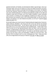 garantiert die Rechte und Freiheiten, die demokratischen Wahlen zugrunde liegen, nicht in aus reichendem Maße, da sie sich auf Verbote zum Schutz des Staates konzentriert und Rechts vorschriften zulässt, die weitere unzulässige Einschränkungen mit sich bringen. Die Mitglieder des 600 Sitze zählenden Parlaments werden für eine fünfjährige Amtszeit [zuvor vier Jahre] nach einem Verhältniswahlsystem in 87 Mehrpersonenwahlkreisen gewählt. Vor der Wahl sind Koalitionen erlaubt, aber die Parteien, die in einer Koalition kandidieren, müssen individuelle Listen einreichen. Im Einklang mit einer langjährigen Empfehlung der OSZE und der Vene dig-Kommission des Europarats wurde mit den Gesetzesänderungen von 2022 die Hürde für Parteien und Koalitionen, um in das Parlament einzuziehen, von 10 % auf 7 % gesenkt (OSCE/ ODIHR 15.5.2023 S.6f.). Bei den gleichzeitig mit der ersten Runde der Präsidentschaftswahl stattgefundenen Parlaments wahlen erhielt die „ Volksallianz“ unter Führung der AKP mit 49 % der Stimmen eine absolute Mehrheit der 600 Parlamentssitze. - Die AKP gewann hierbei 268 (35,6 %), die ultranationalis tische MHP 50 (10,1 %) und die islamistische Neue Wohlfahrtspartei - Yeniden Refah Partisi (YRP) fünf Sitze (2,8 %). Das Oppositionsbündnis „Allianz der Nation“ unter der Führung der säkularen, sozialdemokratisch ausgerichteten CHP erlangte 35 %, wobei die CHP 169 (25,3 %) und die nationalistische İYİ-Partei 43 Sitze (9,7 %) errang. Aus dem Bündnis mehrerer Links parteien unter dem Namen „Arbeit und Freiheitsallianz“ schafften die Links-Grüne Partei - Yeşil Sol Parti (YSP) mit künftig 61 (8,8 %) und die „Arbeiterpartei der Türkei“ -Türkiye İşçi Partisi (TİP) mit vier Abgeordneten den Sprung ins Parlament (TRT 2023; vgl. BBC 22.5.2023). 13