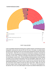 Quelle 2: Duvar 18.5.2023 In der neu gewählten Nationalversammlung sitzen zusätzlich Vertreter und Vertreterinnen mehrer Kleinparteien, welche auf den Listen der AKP, der CHP und er YSP standen. So entfallen [Stand: Mai 2023] von den 268 Sitzen der AKP vier auf die kurdisch-islamistische Partei der Freien Sache, Hür Dava Partisi - HÜDA-PAR und ein Sitz auf die Demokratische Linkspartei, Demokratik Sol Parti - DSP. Von den 149 Mandaten der CHP gehören 14 der Partei für Demokratie und Fortschritt, Demokrasi ve Atılım Partisi - DEVA [des ehemaligen Wirtschaftsministers Ali Babacan], zehn der Zukunftspartei, Gelecek Partisi - GP [des ehemaligen Ministerpräsidenten Ahmet Davutoğlu] und weitere zehn der islamisch-konservativen Partei der Glückseligkeit, Saadet Partisi -SP und drei der Demokratischen Partei, Demokrat Parti - DP. Über die CHP-Liste bekam die ansonsten eigenständig kandidierende İYİ-Partei zu ihren 43 Sitzen noch einen Sitz dazu. Über die Listen der Links-Grünen Partei erhielten die Partei der Arbeit, Emek Partisi - EMEP zwei sowie die Partei der Sozialen Freiheit, Toplumsal Özgürlük Partisi - TÖP eines der YSP-Mandate [Anm.: Die Zahl der YSP von 63 in der Grafik entspricht nicht jener des amtlichen Wahlresultats von 61 14