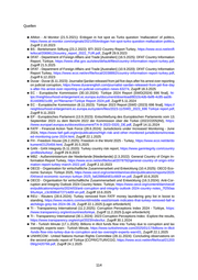 Quellen ■ AlMon - Al Monitor (21.5.2021): Erdogan in hot spot as Turks question ’mafiazation’ of politics, https://www.al-monitor.com/originals/2021/05/erdogan-hot-spot-turks-question-mafiazation-politics , Zugriff 2.10.2023 ■ BS - Bertelsmann Stiftung (23.2.2022): BTI 2022 Country Report Turkey, https://www.ecoi.net/en/fi le/local/2069612/country_report_2022_TUR.pdf, Zugriff 29.9.2023 ■ DFAT - Department of Foreign Affairs and Trade [Australien] (16.5.2025): DFAT Country Information Report; Türkiye, https://www.dfat.gov.au/sites/default/files/country-information-report-turkey.pdf , Zugriff 21.5.2025 ■ DFAT - Department of Foreign Affairs and Trade [Australien] (10.9.2020): DFAT Country Information Report Turkey, https://www.ecoi.net/en/file/local/2038892/country-information-report-turkey.pdf , Zugriff 6.12.2023 ■ Duvar - Duvar (6.11.2023): Journalist Şardan released from jail five days after his arrest over reporting on judicial corruption, https://www.duvarenglish.com/journalist-sardan-released-from-jail-five-day s-after-his-arrest-over-reporting-on-judicial-corruption-news-63274 , Zugriff 18.3.2025 ■ EC - Europäische Kommission (30.10.2024): Türkiye 2024 Report [SWD(2024) 696 final], ht tps://neighbourhood-enlargement.ec.europa.eu/document/download/8010c4db-6ef8-4c85-aa06- 814408921c89_en?filename=Türkiye Report 2024.pdf, Zugriff 5.11.2024 ■ EC - Europäische Kommission (8.11.2023): Türkiye 2023 Report [SWD (2023) 696 final], https:// neighbourhood-enlargement.ec.europa.eu/system/files/2023-11/SWD_2023_696 Türkiye report.pdf, Zugriff 9.11.2023 ■ EP - Europäisches Parlament (13.9.2023): Entschließung des Europäischen Parlaments vom 13. September 2023 zu dem Bericht 2022 der Kommission über die Türkei (2022/2205(INI), https: //www.europarl.europa.eu/doceo/document/TA-9-2023-0320_DE.pdf , Zugriff 14.11.2024 ■ FATF - Financial Action Task Force (28.6.2024): Jurisdictions under Increased Monitoring - June 2024, https://www.fatf-gafi.org/en/publications/High-risk-and-other-monitored-jurisdictions/increas ed-monitoring-june-2024.html , Zugriff 22.1.2025 ■ FH - Freedom House (26.2.2025): Freedom in the World 2025 - Turkey, https://www.ecoi.net/de/do kument/2125459.html, Zugriff 20.5.2025 ■ GAN - GAN Integrety (5.11.2020): Turkey country risk report, https://www.ganintegrity.com/country -profiles/turkey/, Zugriff 29.9.2023 ■ MBZ - Außenministerium der Niederlande [Niederlande] (2.3.2022): General Country of Origin In formation Report Turkey, https://www.ecoi.net/en/file/local/2078792/general-country-of-origin-infor mation-report-turkey-march-2022.pdf , Zugriff 2.10.2023 ■ OECD - Organisation für wirtschaftliche Zusammenarbeit und Entwicklung (10.4.2025): OECD Eco nomic Surveys: Türkiye 2025, https://www.oecd.org/content/dam/oecd/en/publications/reports/2025 /04/oecd-economic-surveys-turkiye-2025_fa62886d/d01c660f-en.pdf , Zugriff 10.6.2025 ■ OECD - Organisation für wirtschaftliche Zusammenarbeit und Entwicklung (16.3.2024): Anti-Cor ruption and Integrity Outlook 2024 Country Notes: Turkiye, https://www.oecd.org/content/dam/oecd/ en/publications/reports/2024/03/anti-corruption-and-integrity-outlook-2024-country-notes_7f250aa 9/turkiye_c3c908bd/72714d5f-en.pdf, Zugriff 10.6.2025 ■ REU - Reuters (28.6.2024): Turkey removed from FATF money laundering grey list in boost to standing, https://www.reuters.com/world/middle-east/simsek-indicates-that-turkey-removed-fatf-w atchdogs-grey-list-2024-06-28 , Zugriff 22.1.2025 [Login erforderlich] ■ TI - Transparency International (11.2.2025): Corruption Perceptions Index 2024 - Türkiye, https: //www.transparency.org/en/countries/türkiye, Zugriff 11.2.2025 [Login erforderlich] ■ TI - Transparency International (30.1.2024): 2023 Corruption Perceptions Index: Explore the results, https://www.transparency.org/en/cpi/2023/index/tur, Zugriff 30.1.2024 ■ TM - Turkish Minute (17.1.2025): Billions in illicit funds flow into Turkey due to corruption and lax oversight, experts warn - Turkish Minute, https://www.turkishminute.com/2025/01/17/billions-in-illicit -funds-flow-into-turkey-due-to-corruption-and-lax-oversight-experts-warn01 , Zugriff 22.1.2025 ■ UNHRCOM - United Nations Human Rights Committee (28.11.2024): Concluding observations on the second periodic report of Türkiye [CCPR/C/TUR/CO/2, https://www.ecoi.net/en/file/local/21203 09/g2420766.pdf, Zugriff 24.1.2025 114