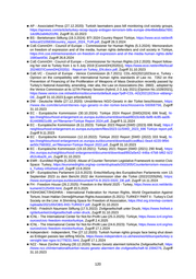 ■ AP - Associated Press (27.12.2020): Turkish lawmakers pass bill monitoring civil society groups, https://apnews.com/article/turkey-recep-tayyip-erdogan-terrorism-bills-europe-d4e48ebdbba7691 1dc6fb2a94b201ffd, Zugriff 31.10.2023 ■ BS - Bertelsmann Stiftung (19.3.2024): BTI 2024 Country Report Türkiye, https://www.ecoi.net/en/fi le/local/2105839/country_report_2024_TUR.pdf, Zugriff 26.3.2024 ■ CoE-CommDH - Council of Europe – Commissioner for Human Rights (5.3.2024): Memorandum on freedom of expression and of the media, human rights defenders and civil society in Türkiye, https://rm.coe.int/memorandum-on-freedom-of-expression-and-of-the-media-human-rights-defe/ 1680aebf3d, Zugriff 26.8.2024 ■ CoE-CommDH - Council of Europe – Commissioner for Human Rights (19.2.2020): Report follow ing her visit to Turkey from 1 to 5 July 2019 [CommDH(2020)1], https://www.ecoi.net/en/file/local/ 2024837/CommDH(2020)1 - Report on Turkey_EN.docx.pdf, Zugriff 31.10.2023 ■ CoE-VC - Council of Europe - Venice Commission (6.7.2021): CDL-AD(2021)023cor-e, Turkey - Opinion on the compatibility with international human rights standards of Law no. 7262 on the Prevention of Financing of the Proliferation of Weapons of Mass Destruction recently passed by Turkey’s National Assembly, amending, inter alia, the Law on Associations (No. 2860) , adopted by the Venice Commission at its 127th Plenary Session (hybrid, 2-3 July 2021) [Opinion No.1028/2021], https://www.venice.coe.int/webforms/documents/default.aspx?pdf=CDL-AD(2021)023cor-e&lang= DE, Zugriff 31.10.2023 [Login erforderlich] ■ DW - Deutsche Welle (27.12.2020): Umstrittenes NGO-Gesetz in der Türkei beschlossen, https: //www.dw.com/de/umstrittenes-ngo-gesetz-in-der-türkei-beschlossen/a-56068756 , Zugriff 31.10.2023 ■ EC - Europäische Kommission (30.10.2024): Türkiye 2024 Report [SWD(2024) 696 final], ht tps://neighbourhood-enlargement.ec.europa.eu/document/download/8010c4db-6ef8-4c85-aa06- 814408921c89_en?filename=Türkiye Report 2024.pdf, Zugriff 5.11.2024 ■ EC - Europäische Kommission (8.11.2023): Türkiye 2023 Report [SWD (2023) 696 final], https:// neighbourhood-enlargement.ec.europa.eu/system/files/2023-11/SWD_2023_696 Türkiye report.pdf, Zugriff 9.11.2023 ■ EC - Europäische Kommission (12.10.2022): Türkiye 2022 Report [SWD (2022) 333 final], ht tps://neighbourhood-enlargement.ec.europa.eu/document/download/ccedfba1-0ea4-4220-9f94- ae50c7fd0302_en?filename=Türkiye Report 2022.pdf, Zugriff 31.10.2023 ■ EC - Europäische Kommission (19.10.2021): Turkey 2021 Report [SWD (2021) 290 final], https: //ec.europa.eu/neighbourhood-enlargement/document/download/892a5e42-448a-47b8-bf62-b22 d52c4ba26_en, Zugriff 31.10.2023 ■ EMR - EuroMed Rights (5.2024): Abuse of Counter-Terrorism Legislative Framework to restrict Civic Space: Turkey, https://euromedrights.org/wp-content/uploads/2023/05/Counterterrorism-measure s_Turkey-infosheet.pdf, Zugriff 13.8.2024 ■ EP - Europäisches Parlament (13.9.2023): Entschließung des Europäischen Parlaments vom 13. September 2023 zu dem Bericht 2022 der Kommission über die Türkei (2022/2205(INI), https: //www.europarl.europa.eu/doceo/document/TA-9-2023-0320_DE.pdf , Zugriff 14.11.2024 ■ FH - Freedom House (26.2.2025): Freedom in the World 2025 - Turkey, https://www.ecoi.net/de/do kument/2125459.html, Zugriff 20.5.2025 ■ FIDH/OMCT/İHD/HRA - International Federation for Human Rights, World Organisation Against Torture, İnsan Hakları Derneği/Human Rights Association (5.2021): TURKEY PART II - Turkey’s Civil Society on the Line: A Shrinking Space for Freedom of Association, https://ihd.org.tr/en/wp-content /uploads/2021/05/OBS-İHD-TURKEY.pdf, Zugriff 31.10.2023 ■ FNS - Friedrich Naumann Stiftung (17.5.2022): Zivilgesellschaft unter Druck, https://www.freiheit.o rg/de/tuerkei/zivilgesellschaft-unter-druck, Zugriff 31.10.2023 ■ ICNL - The International Center for Not-for-Profit Law (25.3.2025): Türkiye, https://www.icnl.org/res ources/civic-freedom-monitor/turkiye, Zugriff 2.4.2025 ■ ICNL - The International Center for Not-for-Profit Law (24.6.2023): Türkiye, https://www.icnl.org/res ources/civic-freedom-monitor/turkiye, Zugriff 17.1.2024 ■ Independent - Independent, The (27.12.2020): Turkish human rights groups face being shut down as Erdogan passes law stifling NGOs, https://www.independent.co.uk/news/world/europe/turkey-o versight-law-ngos-b1779231.html , Zugriff 17.1.2024 ■ NZZ - Neue Zürcher Zeitung (30.12.2020): Neues Gesetz alarmiert türkische Zivilgesellschaft, https: //www.nzz.ch/international/tuerkei-neues-gesetz-alarmiert-die-zivilgesellschaft-ld.1594276 , Zugriff 31.10.2023 120