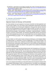 ■ UNHRCOM - United Nations Human Rights Committee (28.11.2024): Concluding observations on the second periodic report of Türkiye [CCPR/C/TUR/CO/2, https://www.ecoi.net/en/file/local/21203 09/g2420766.pdf, Zugriff 24.1.2025 ■ USDOS - United States Department of State [USA] (22.4.2024): Country Report on Human Rights Practices 2023 – Turkey (Türkiye), https://www.state.gov/wp-content/uploads/2024/02/528267_TU ̈RKIYE-2023-HUMAN-RIGHTS-REPORT.pdf , Zugriff 23.4.2024 [Login erforderlich] ■ USDOS - United States Department of State [USA] (20.3.2023): Country Report on Human Rights Practices 2022 – Turkey (Türkiye), https://www.state.gov/wp-content/uploads/2023/03/415610_TU ̈RKIYE-2022-HUMAN-RIGHTS-REPORT.pdf , Zugriff 29.9.2023 12 Meinungs- und Pressefreiheit / Internet Letzte Änderung 2025-08-06 13:34 Allgemeine Situation der Meinungs- und Pressefreiheit Die Türkei befindet sich laut Europäischer Kommission hinsichtlich der Meinungsfreiheit noch in einem frühen Stadium. Die in den letzten Jahren beobachteten gravierenden Rückschritte haben sich fortgesetzt. Die Umsetzung der Strafgesetze in Bezug auf die nationale Sicherheit und die Terrorismusbekämpfung verstößt weiterhin gegen die EMRK und weicht von der Recht sprechung des EGMR ab. Es kommt weiterhin zu Fällen von Verurteilungen von Journalisten, Menschenrechtsverteidigern, Rechtsanwälten, Schriftstellern, Oppositionspolitikern, Studenten, Künstlern und Nutzern sozialer Medien. Die Verbreitung oppositioneller Stimmen und das Recht auf freie Meinungsäußerung wird durch den zunehmenden Druck und die restriktiven Maßnah men beeinträchtigt (EC 8.11.2023, S. 33f.; vgl. EEAS 29.5.2024, S. 23, UNHRCOM 28.11.2024, S. 12). Nach den Wahlen von 2023 wurden Gewalt und Massenverhaftungen zu den häufigsten Mitteln, um Medienvertreter zu unterdrücken, die über Kundgebungen und Proteste berichteten. Die fast systematische Online-Zensur, willkürliche Gerichtsverfahren gegen kritische Medien und die Ausnutzung des Justizsystems haben bislang nicht zu einer Erholung der Beliebtheitswerte des „ Hyperpräsidenten“ geführt, der weiterhin in einen großen Fall von politischer Klientelpolitik verwickelt ist (RSF 2.5.2025). Hart fällt die Beurteilung der Menschenrechtskommissarin des Europarates aus. Die Kommis sarin, Dunja Mijatović, stellte Anfang März 2024 [Anm. kurz vor dem Ende ihres Mandates] in einem mehrseitigen Memorandum fest, „ dass die ablehnende Haltung der türkischen Behörden gegenüber der freien Meinungsäußerung und der Medienfreiheit sowie das hohe Maß an Into leranz gegenüber legitimer Kritik an den Handlungen der Behörden und der gewählten Vertreter ein neues, besorgniserregendes Niveau erreicht haben und sich weiterhin durch systemati schen Druck und rechtliche Maßnahmen gegen Journalisten, Menschenrechtsaktivisten, die Zivilgesellschaft und einfache Menschen äußern. Dies hat zu einem erschreckenden Ausmaß an Selbstzensur und einem Mangel an Pluralismus geführt“ (CoE-CommDH 5.3.2024, S. 2). Und in einer (jüngsten) Entschließung vom Mai 2025 bedauert das Europäische Parlament (EP) „ die anhaltende Strafverfolgung, Zensur und Schikanierung von Journalisten und unabhängigen Medien […]; fordert die türkischen Staatsorgane auf, von weiteren Angriffen auf unabhängige 142