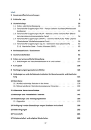 Inhalt 1 Länderspezifische Anmerkungen 1 2 Politische Lage 3 3 Sicherheitslage 20 3.1 Gülen- oder Hizmet-Bewegung . . . . . . . . . . . . . . . . . . . . . . . . . . . 26 3.2 Terroristische Gruppierungen: PKK – Partiya Karkerên Kurdistan (Arbeiterpartei Kurdistans) . . . . . . . . . . . . . . . . . . . . . . . . . . . . . . . . . . . . . . 50 3.3 Terroristische Gruppierungen: MLKP – Marksist Leninist Komünist Parti (Marxis tisch-Leninistische Kommunistische Partei) . . . . . . . . . . . . . . . . . . . . 54 3.4 Terroristische Gruppierungen: DHKP-C – Devrimci Halk Kurtuluş Partisi-Cephesi (Revolutionäre Volksbefreiungspartei-Front) . . . . . . . . . . . . . . . . . . . . 58 3.5 Terroristische Gruppierungen: sog. IS – Islamischer Staat (alias Daesh) . . . . 60 3.5.1 Islamischer Staat – Provinz Khorasan (ISKP) . . . . . . . . . . . . . . . 65 4 Rechtsstaatlichkeit / Justizwesen 67 5 Sicherheitsbehörden 91 6 Folter und unmenschliche Behandlung 97 6.1 Entführungen und Verschwindenlassen im In- und Ausland . . . . . . . . . . . 103 7 Korruption 109 8 Nichtregierungsorganisationen (NGOs) 115 9 Ombudsperson und die Nationale Institution für Menschenrechte und Gleichstel lung 121 10 Wehrdienst 123 10.1 Kurdisch-stämmige Rekruten in der Armee . . . . . . . . . . . . . . . . . . . . 128 10.2 Wehrersatzdienst / Wehrdienstverweigerung / Desertion . . . . . . . . . . . . . 130 11 Allgemeine Menschenrechtslage 137 12 Meinungs- und Pressefreiheit / Internet 142 13 Versammlungs- und Vereinigungsfreiheit 164 13.1 Opposition . . . . . . . . . . . . . . . . . . . . . . . . . . . . . . . . . . . . . . 173 14 Verfolgung fremder Staatsbürger wegen Straftaten im Ausland 199 15 Haftbedingungen 202 16 Todesstrafe 221 17 Religionsfreiheit und religiöse Minderheiten 222 IV